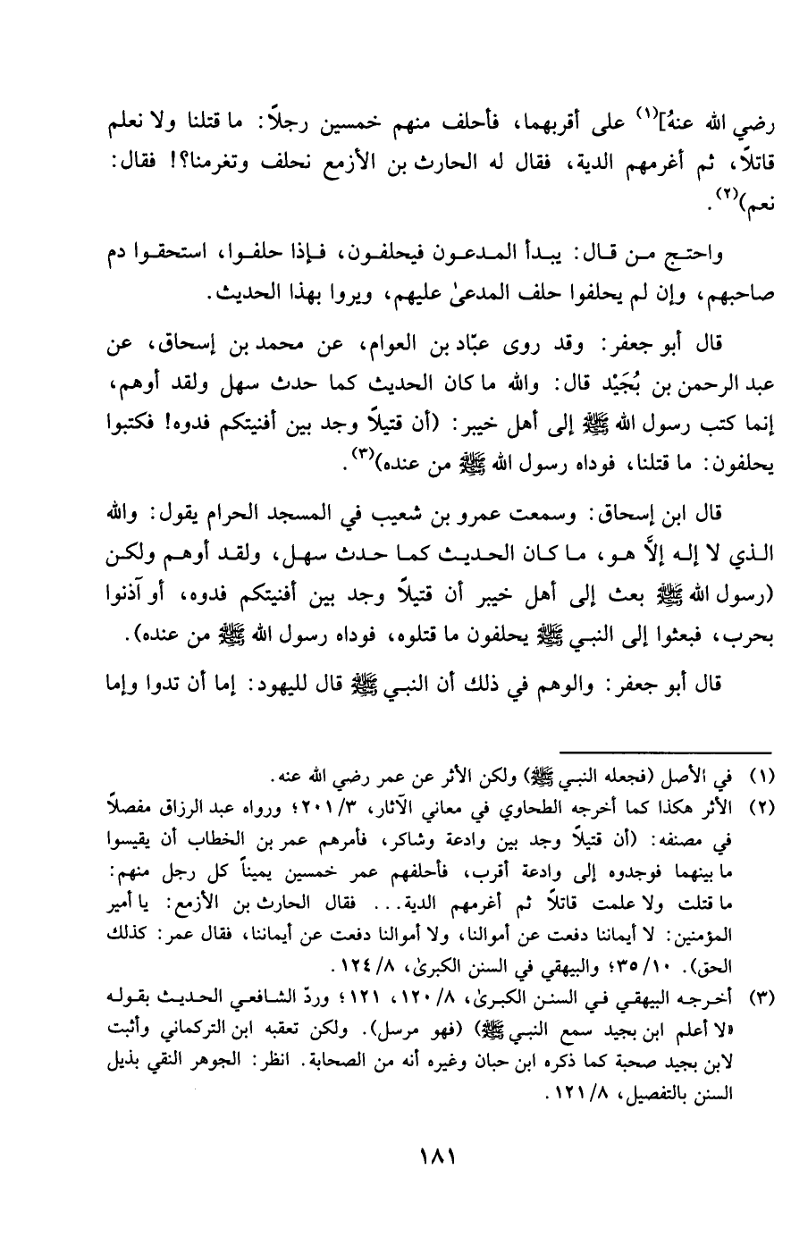 قَالَ أَبُو جَعْفَر وَقد روى عباد بن الْعَوام عَن مُحَمَّد بن إِسْحَاق عَن عبد الرَّحْمَن بن بجيد قَالَ وَالله مَا كَانَ الحَدِيث كَمَا حدث سهل وَلَقَد أوهم إِنَّمَا كتب رَسُول الله صلى الله عَلَيْهِ وَسلم إِلَى أهل خيبرأن قَتِيلا وجد بَين أفنيتكم فدوه فَكَتَبُوا يحلفُونَ مَا قتلنَا فوداه رَسُول الله صلى الله عَلَيْهِ وَسلم من عِنْده