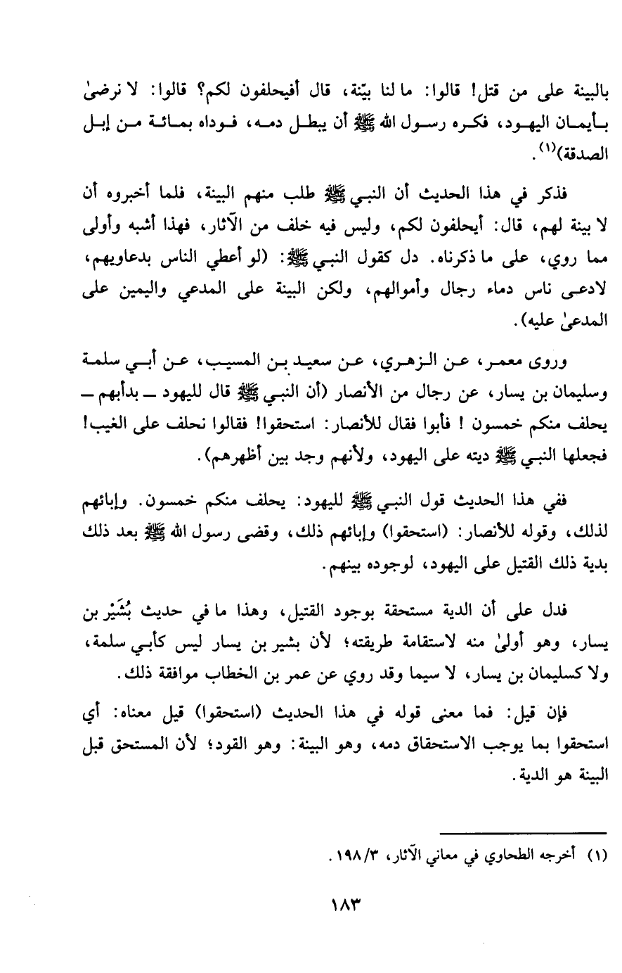 فَدلَّ على أَن الدِّيَة مُسْتَحقَّة بوجد الْقَتِيل وَهَذَا مَا فِي حَدِيث بشير بن يسَار وَهُوَ أولى مِنْهُ لِاسْتِقَامَةِ طَرِيقَته لِأَن بشير بن يسَار لَيْسَ كَأبي سَلمَة وَلَا كسليمان بن يسَار لَا سِيمَا وَقد رُوِيَ عَن عمر بن الْخطاب مُوَافقَة ذَلِك