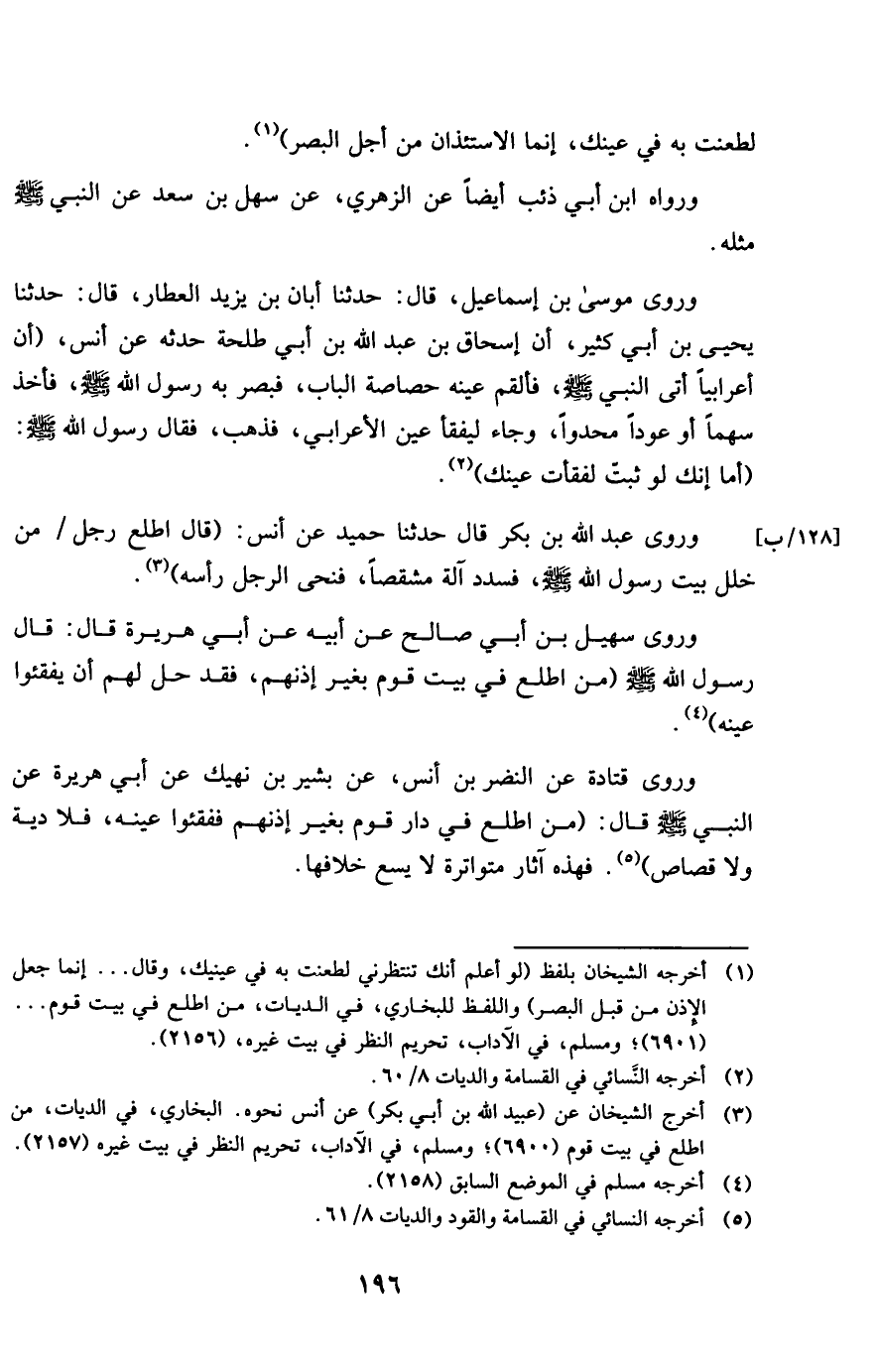 وروى قَتَادَة عَن النَّضر بن أنس عَن بشير بن نهيك عَن أبي هُرَيْرَة عَن النَّبِي صلى الله عَلَيْهِ وَسلم قَالَ من اطلع فِي دَار قوم بِغَيْر إذْنهمْ ففقئوا عينه فَلَا دِيَة وَلَا قصاص فَهَذِهِ آثَار متواترة لَا يسع خلَافهَا