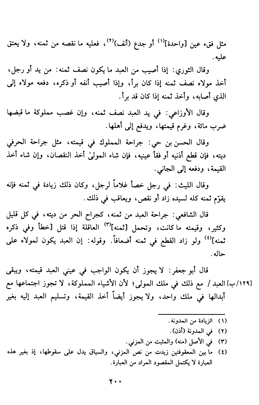 قَالَ الشَّافِعِي جِرَاحَة العَبْد من ثمنه كجراح الْحر من دِيَته فِي كل قَلِيل وَكثير وَقِيمَته مَا كَانَت وَتحمل ثمنه الْعَاقِلَة إِذا قتل خطأ وَفِي ذكره ثمنه وَلَو زَاد الْقطع فِي ثمنه أضعافا وَقَوله إِن لعبد يكون لمَوْلَاهُ على حَاله