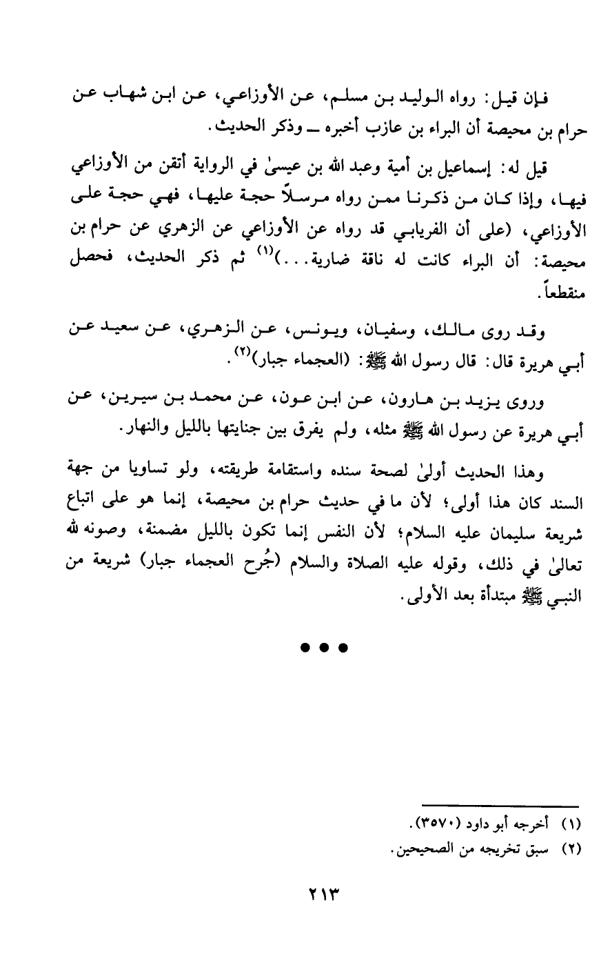 قيل لَهُ إِسْمَاعِيل بن أُميَّة وَعبد الله بن عِيسَى فِي الوراية أتقن من الْأَوْزَاعِيّ فِيهَا وَإِذا كَانَ من ذكرنَا مِمَّن رَوَاهُ مُرْسلا حجَّة عَلَيْهَا فَهِيَ حجَّة على الْأَوْزَاعِيّ على أَن الْفرْيَابِيّ قد رَوَاهُ عَن الْأَوْزَاعِيّ عَن الزُّهْرِيّ عَن حرَام بن محيصة أَن الْبَراء كَانَت لَهُ نَاقَة ضارية ثمَّ ذكر الحَدِيث فَحصل مُنْقَطِعًا