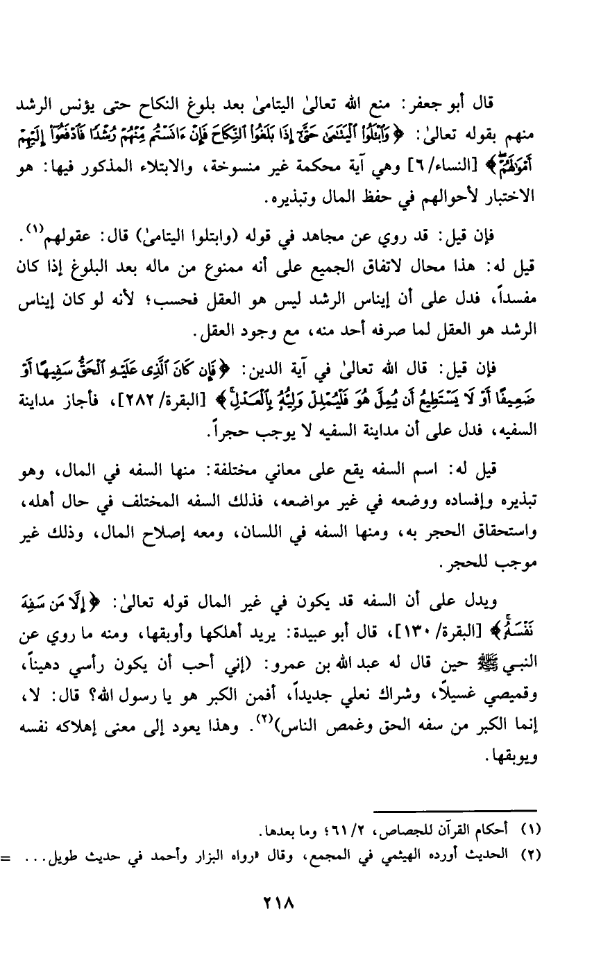 قَالَ أَبُو جَعْفَر منع الله تَعَالَى الْيَتَامَى بعد بُلُوغ النِّكَاح حَتَّى يؤنس الرشد مِنْهُم بقوله تَعَالَى {وابتلوا الْيَتَامَى حَتَّى إِذا بلغُوا النِّكَاح فَإِن آنستم مِنْهُم رشدا فادفعوا إِلَيْهِم أَمْوَالهم} النِّسَاء 6 وَهِي آيَة محكمَة غير مَنْسُوخَة والابتلاء الْمَذْكُور فِيهَا هُوَ الاختبار لأحوالهم فِي حفظ المَال وتبذيره