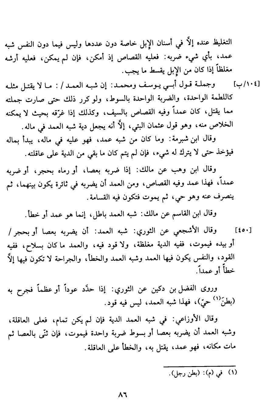 وَقَالَ الشجعي عَن الثَّوْريّ شبه الْعمد أَن يضْربهُ بعصا أَو بِحجر أَو بِيَدِهِ فَيَمُوت فَفِيهِ الدِّيَة مُغَلّظَة وَلَا قَود فِيهِ والعمد مَا كَانَ بسلاح فَفِيهِ الْقود وَالنَّفس يكون فِيهَا الْعمد وَشبه الْعمد وَالْخَطَأ والجراحة لَا تكون فِيهَا إِلَّا خطأ أَو عمدا