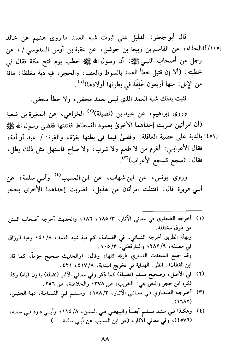 قَالَ أَبُو جَعْفَر الدَّلِيل على ثُبُوت شبه الْعمد مَا روى هشيم عَن خَالِد الْحذاء عَن الْقَاسِم بن ربيعَة بن جوشن عَن عقبَة بن أَوْس السدُوسِي عَن رجل من أَصْحَاب النَّبِي صلى الله عَلَيْهِ وَسلم أَن رَسُول الله صلى الله عَلَيْهِ وَسلم خطب يَوْم فتح مَكَّة فَقَالَ فِي خطبَته أَلا إِن قَتِيل خطأ الْعمد بِالسَّوْطِ والعصا وَالْحجر فِيهِ دِيَة مُغَلّظَة مائَة من الْإِبِل مِنْهَا أَرْبَعُونَ خلفة فِي بطونها أَوْلَادهَا