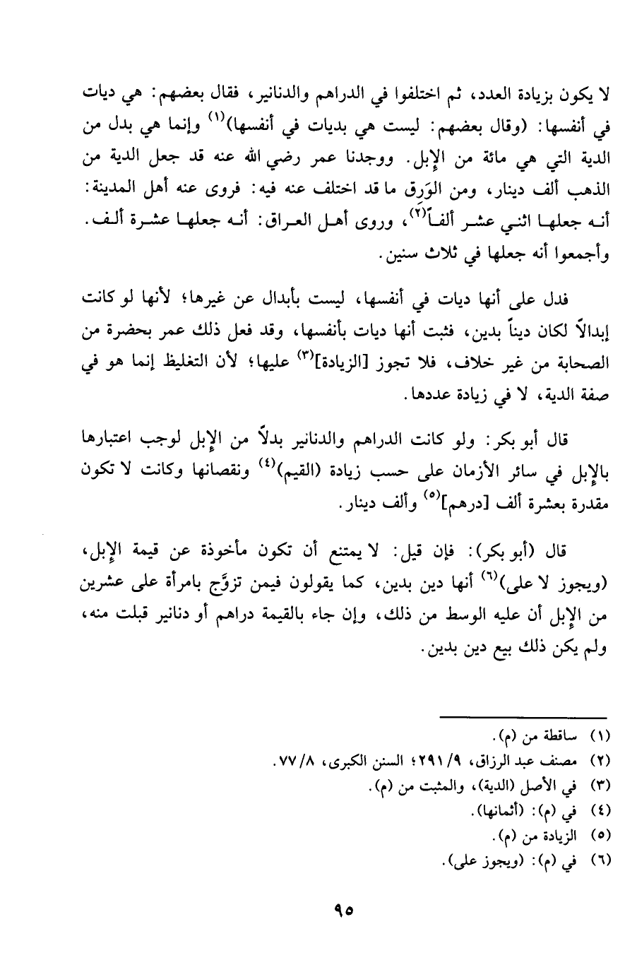 قَالَ أَبُو بكر فَإِن قيل لَا يمْتَنع أَن تكون مَأْخُوذَة عَن قيمَة الْإِبِل وَيجوز لَا على أَنَّهَا دين بدين كَمَا يَقُولُونَ فِيمَن تزوج بِامْرَأَة على عشْرين من الْإِبِل أَن عَلَيْهِ الْوسط من ذَلِك وَإِن جَاءَ بِالْقيمَةِ دَرَاهِم أَو دَنَانِير قبلت مِنْهُ وَلم يكن ذَلِك بيع دين بدين