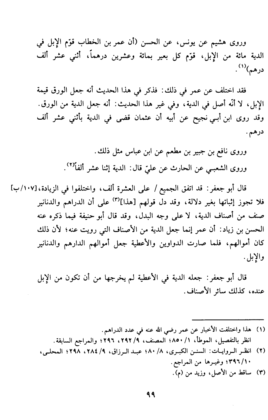 قَالَ أَبُو جَعْفَر قد اتّفق الْجَمِيع على الْعشْرَة ألف وَاخْتلفُوا فِي الزِّيَادَة فَلَا تجوز إِثْبَاتهَا بِغَيْر دلَالَة وَقد دلّ قَوْلهم هَذَا على أَن الدَّرَاهِم وَالدَّنَانِير صنف من أَصْنَاف الدِّيَة لَا على وَجه الْبَدَل وَقد قَالَ أَبُو حنيفَة فِيمَا ذكره عَنهُ الْحسن بن زِيَاد أَن عمر إِنَّمَا جعل الدِّيَة من الْأَصْنَاف الَّتِي رويت عَنهُ لِأَن ذَلِك كَانَ أَمْوَالهم فَلَمَّا صَارَت الدَّوَاوِين والأعطية جعل أَمْوَالهم الدَّرَاهِم وَالدَّنَانِير وَالْإِبِل
