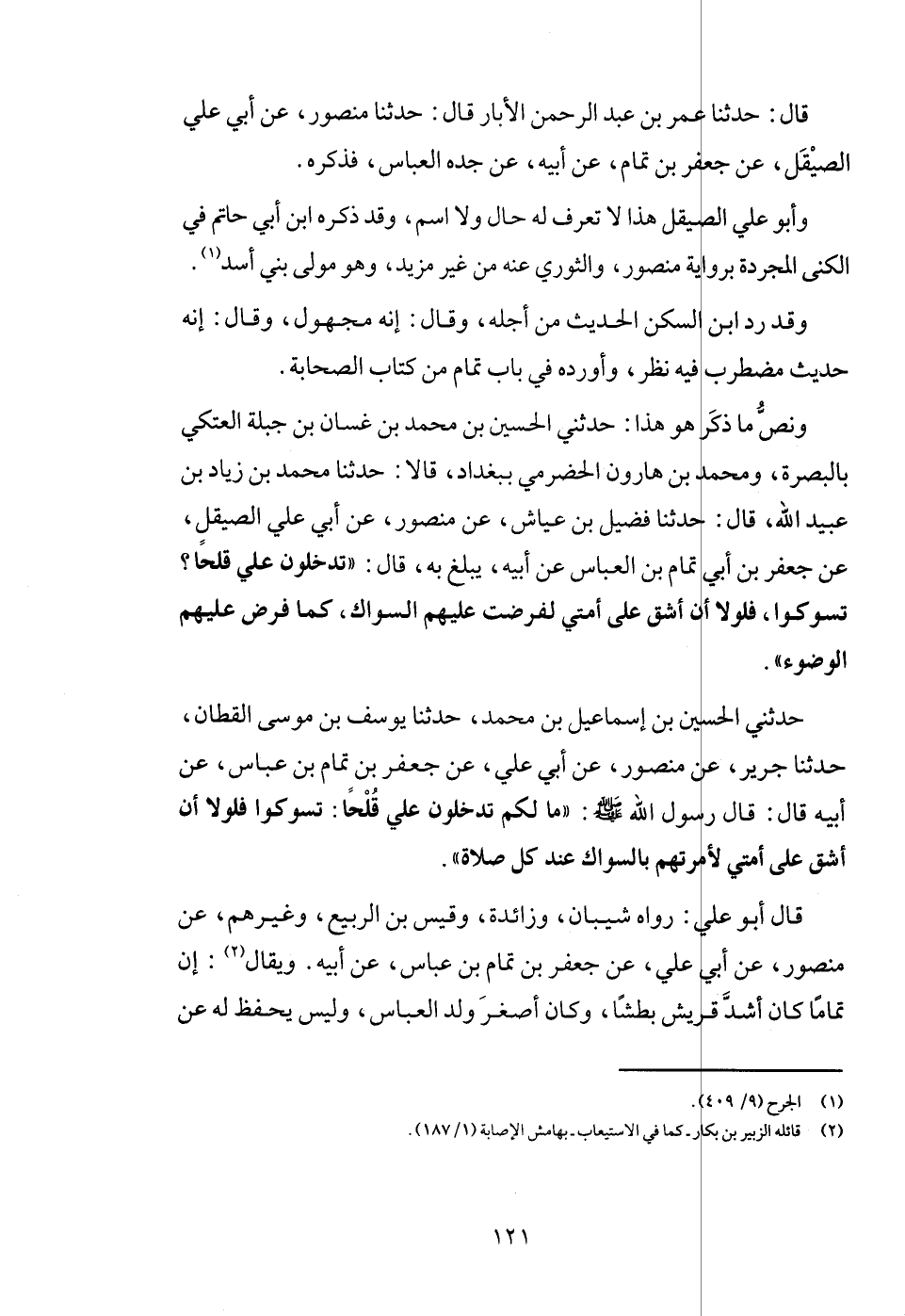 وَنَصّ مَا ذكر هُوَ هَذَا: حَدثنِي الْحُسَيْن بن مُحَمَّد بن غَسَّان بن جبلة الْعَتكِي بِالْبَصْرَةِ، وَمُحَمّد بن هَارُون الْحَضْرَمِيّ بِبَغْدَاد، قَالَا: حَدثنَا مُحَمَّد بن زِيَاد بن عبيد الله، قَالَ: حَدثنَا فُضَيْل بن عَيَّاش، عَن مَنْصُور، عَن أبي عَليّ الصيقل، عَن جَعْفَر بن أبي تَمام بن الْعَبَّاس عَن أَبِيه، يبلغ بِهِ، قَالَ: " تدخلون عَليّ قلحاً؟ تسوكوا، فلولا أَن أشق على أمتِي لفرضت عَلَيْهِم السِّوَاك، كَمَا فرض عَلَيْهِم الْوضُوء ".