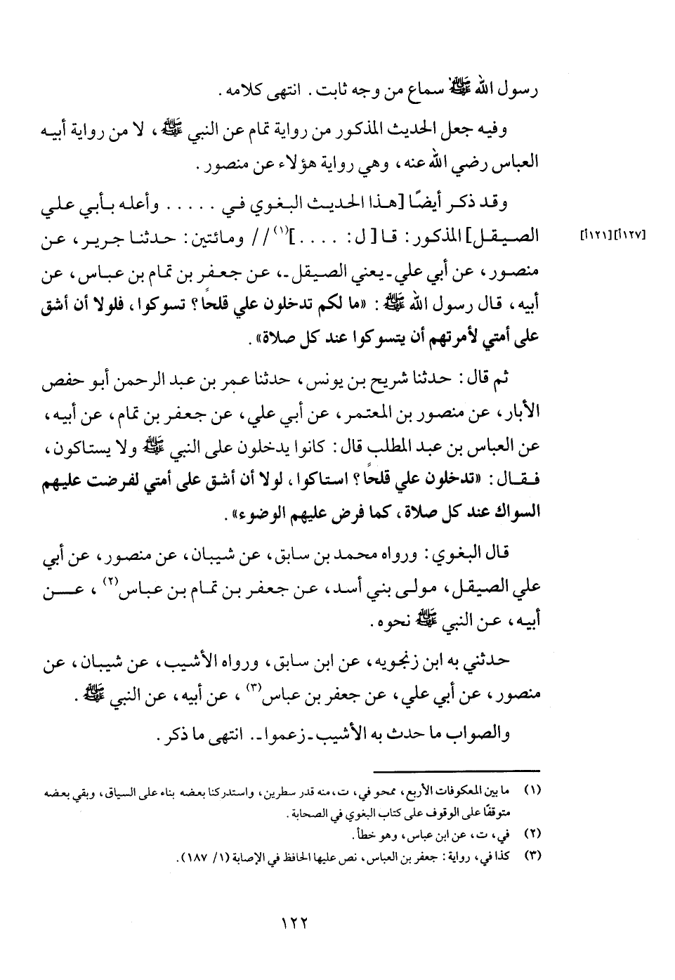 ثمَّ قَالَ: حَدثنَا شُرَيْح بن يُونُس، حَدثنَا عمر بن عبد الرَّحْمَن أَبُو حَفْص الْأَبَّار، عَن مَنْصُور بن الْمُعْتَمِر، عَن أبي عَليّ، عَن جَعْفَر بن تَمام، عَن أَبِيه، عَن الْعَبَّاس بن عبد الْمطلب قَالَ: كَانُوا يدْخلُونَ على النَّبِي - صَلَّى اللَّهُ عَلَيْهِ وَسَلَّم َ - وَلَا يستاكون، فَقَالَ: " تدخلون عَليّ قلحاً؟ استاكوا، لَوْلَا أَن أشق على أمتِي لفرضت عَلَيْهِم السِّوَاك عِنْد كل صَلَاة، كَمَا فرض عَلَيْهِم الْوضُوء ".