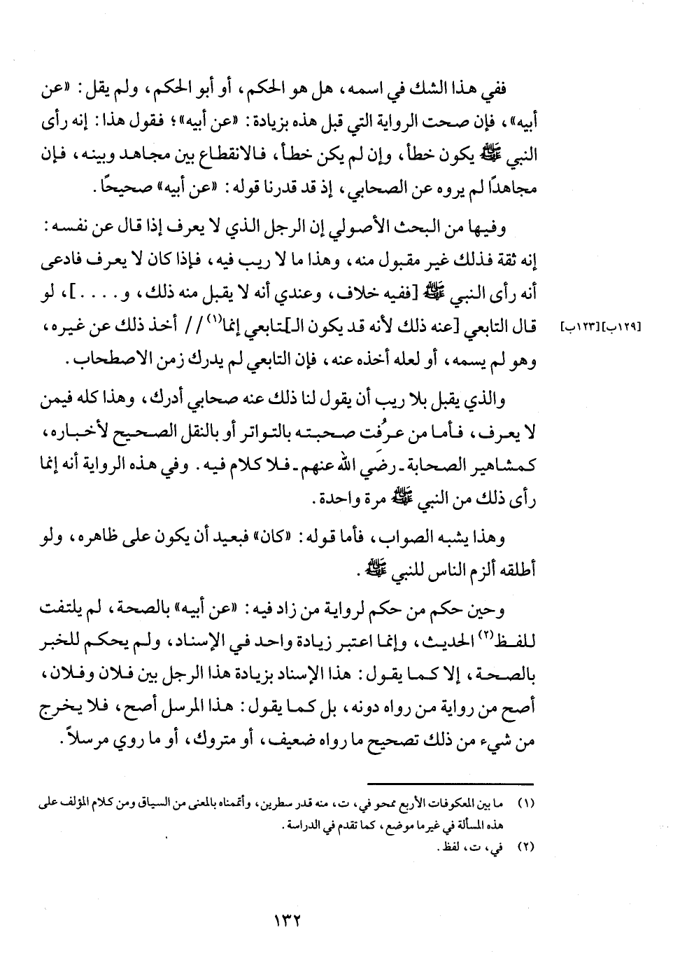وفيهَا من الْبَحْث الأصولي إِن الرجل الَّذِي لَا يعرف إِذا قَالَ عَن نَفسه: إِنَّه ثِقَة فَذَلِك غير مَقْبُول مِنْهُ، وَهَذَا مَا لَا ريب فِيهِ، فَإِذا كَانَ لَا يعرف فَادّعى أَنه رأى النَّبِي - صَلَّى اللَّهُ عَلَيْهِ وَسَلَّم َ -[فَفِيهِ خلاف، وَعِنْدِي أَنه لايقبل مِنْهُ ذالك، و ... ] ، لَو قَالَ التَّابِعِيّ [عَنهُ ذَلِك لِأَنَّهُ قد يكون التَّابِعِيّ] إِنَّمَا أَخذ ذَلِك عَن غَيره، وَهُوَ لم يسمه، أَو لَعَلَّه أَخذه عَنهُ، فَإِن التَّابِعِيّ لم يدْرك زمن الاصطحاب.