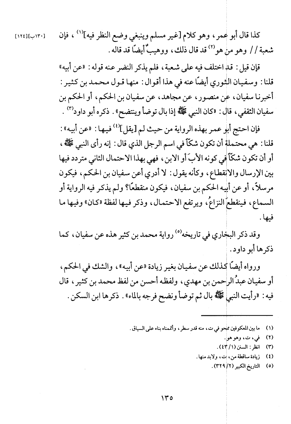 وَرَوَاهُ أَيْضا كَذَلِك عَن سُفْيَان بِغَيْر زِيَادَة " عَن أَبِيه "، وَالشَّكّ فِي الحكم، أَو سُفْيَان عبد الرَّحْمَن بن مهْدي، وَلَفظه أحسن من لفظ مُحَمَّد بن كثير، قَالَ فِيهِ: " رَأَيْت النَّبِي - صَلَّى اللَّهُ عَلَيْهِ وَسَلَّم َ - بَال ثمَّ تَوَضَّأ ونضح فرجه بِالْمَاءِ ". ذكرهَا ابْن السكن.