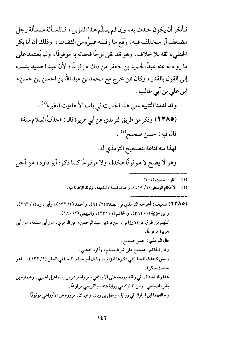 (2385) وَذكر من طَرِيق التِّرْمِذِيّ عَن أبي هُرَيْرَة قَالَ: " حذف السَّلَام سنة ". قَالَ فِيهِ: حسن صَحِيح.