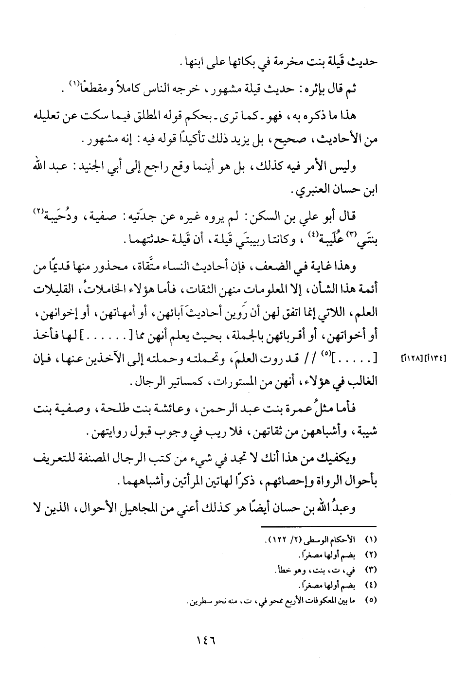 فَأَما مثل عمْرَة بنت عبد الرَّحْمَن، وَعَائِشَة بنت طَلْحَة، وَصفِيَّة بنت شيبَة، وأشباههن من ثقاتهن، فَلَا ريب فِي وجوب قبُول روايتهن.