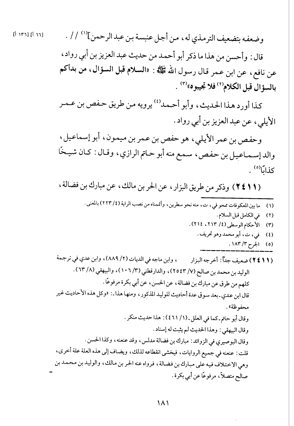 قَالَ: وَأحسن من هَذَا مَا ذكر أَبُو أَحْمد من حَدِيث عبد الْعَزِيز بن أبي رواد، عَن نَافِع، عَن ابْن عمر قَالَ رَسُول الله - صَلَّى اللَّهُ عَلَيْهِ وَسَلَّم َ -: " السَّلَام قبل السُّؤَال، من بَدَأَكُمْ بالسؤال قبل الْكَلَام فَلَا تجيبوه ".