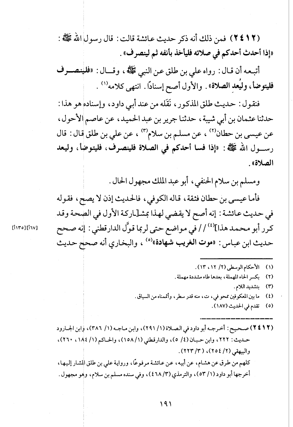 (2412) فَمن ذَلِك أَنه ذكر حَدِيث عَائِشَة قَالَت: قَالَ رَسُول الله - صَلَّى اللَّهُ عَلَيْهِ وَسَلَّم َ -: " إِذا أحدث أحدكُم فِي صلَاته فليأخذ بِأَنْفِهِ ثمَّ لينصرف "