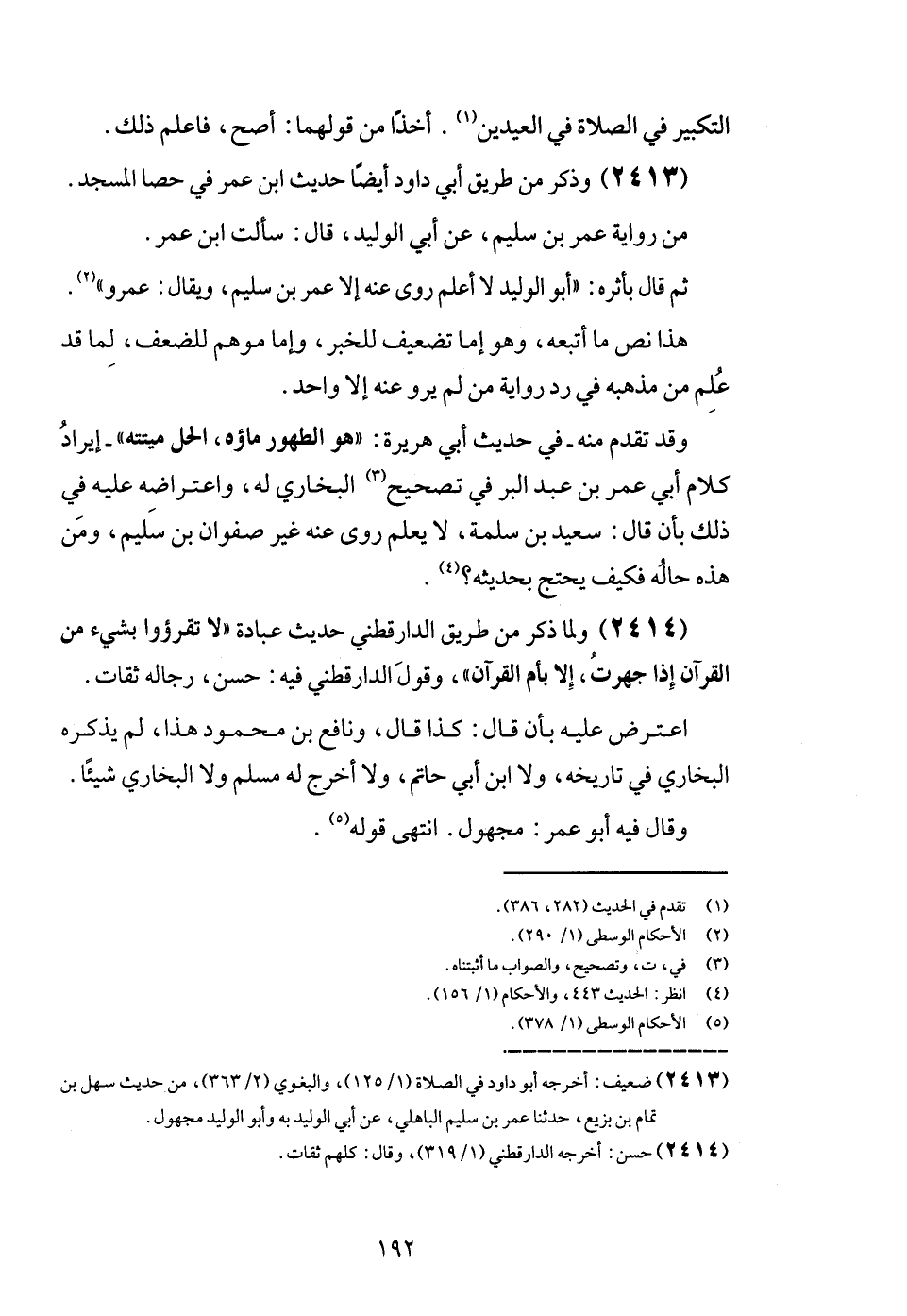 (2414) وَلما ذكر من طَرِيق الدَّارَقُطْنِيّ حَدِيث عبَادَة " لَا تقرؤا بِشَيْء من الْقُرْآن إِذا جهرت، إِلَّا بِأم الْقُرْآن "، وَقَول الدَّارَقُطْنِيّ فِيهِ: حسن، رِجَاله ثِقَات.