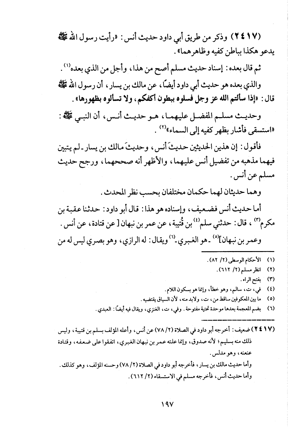 (2417) وَذكر من طَرِيق أبي دَاوُد حَدِيث أنس: " رَأَيْت رَسُول الله - صَلَّى اللَّهُ عَلَيْهِ وَسَلَّم َ - يَدْعُو هَكَذَا بباطن كفيه وظاهرهما ".