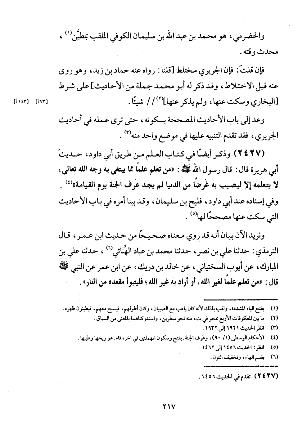 (2427) وَذكر أَيْضا فِي كتاب الْعلم من طَرِيق أبي دَاوُد، حَدِيث أبي هُرَيْرَة قَالَ: قَالَ رَسُول الله - صَلَّى اللَّهُ عَلَيْهِ وَسَلَّم َ -: " من تعلم علما مِمَّا يَبْتَغِي بِهِ وَجه الله تَعَالَى، لَا يتعلمه إِلَّا ليصيب بِهِ غَرضا من الدُّنْيَا لم يجد عرف الْجنَّة يَوْم الْقِيَامَة ".