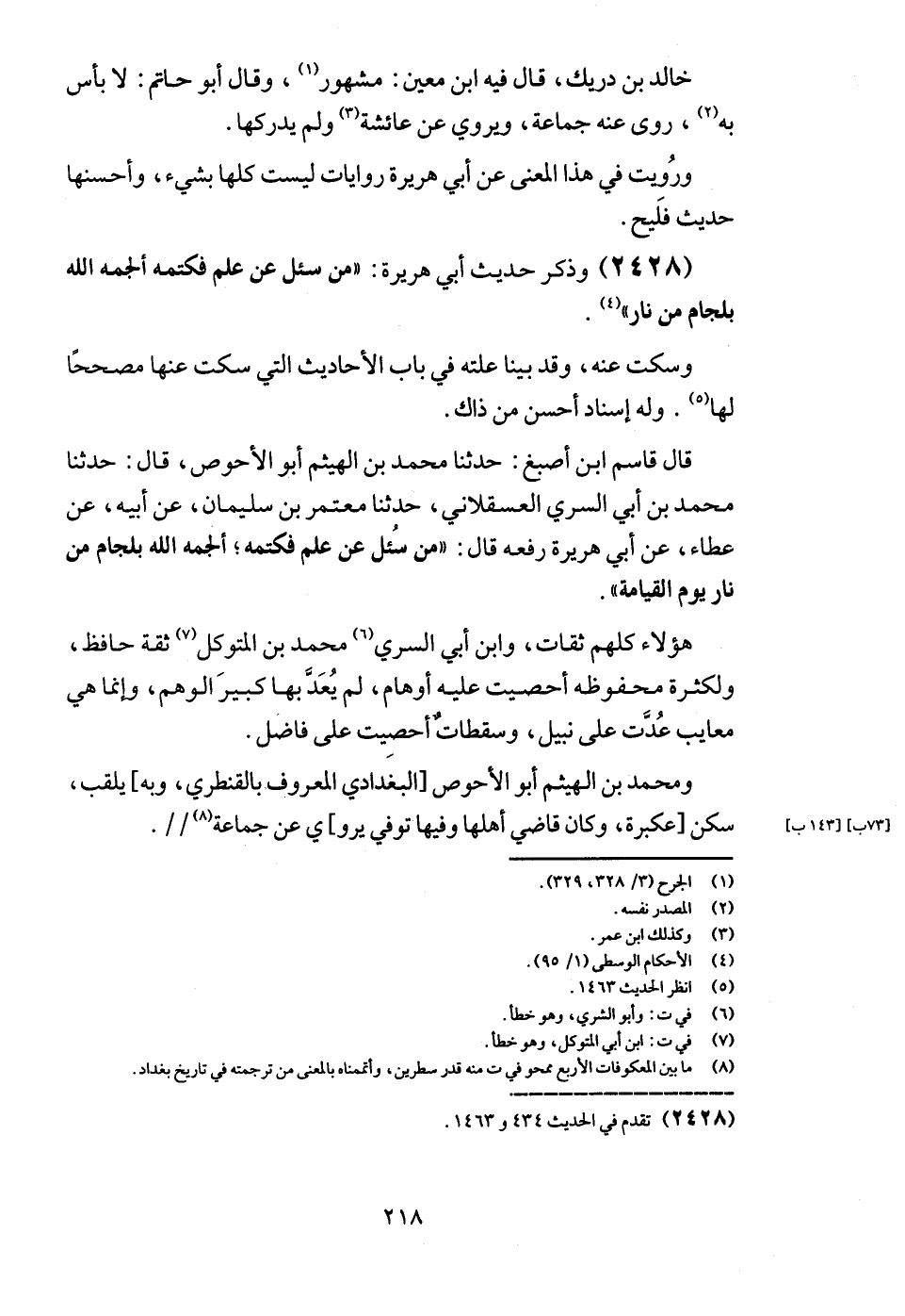 (2428) وَذكر حَدِيث أبي هُرَيْرَة: " من سُئِلَ عَن علم فكتمه ألْجمهُ الله بلجام من نَار ".