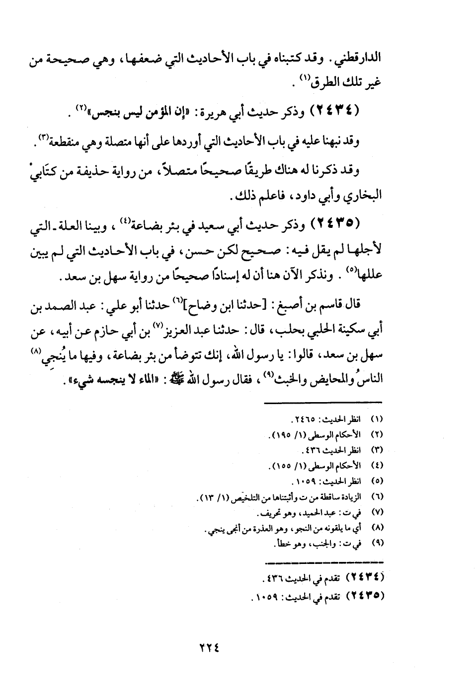 (2435) وَذكر حَدِيث أبي سعيد فِي بِئْر بضَاعَة، وَبينا الْعلَّة الَّتِي لأَجلهَا لم يقل فِيهِ: صَحِيح لَكِن حسن، فِي بَاب الْأَحَادِيث الَّتِي لم يبين عللها. وَنَذْكُر الْآن هُنَا أَن لَهُ إِسْنَادًا صَحِيحا من رِوَايَة سهل بن سعد.