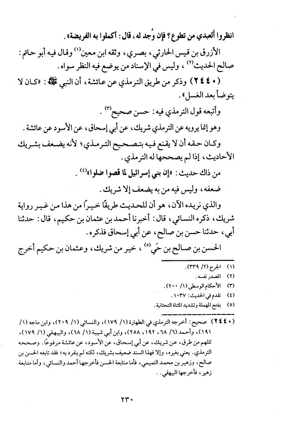 (2440) وَذكر من طَرِيق التِّرْمِذِيّ عَن عَائِشَة، أَن النَّبِي - صَلَّى اللَّهُ عَلَيْهِ وَسَلَّم َ -: " كَانَ لَا يتَوَضَّأ بعد الْغسْل ".