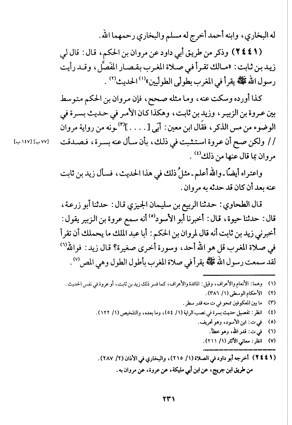 (2441) وَذكر من طَرِيق أبي دَاوُد عَن مَرْوَان بن الحكم، قَالَ: قَالَ لي زيد بن ثَابت: " مَالك تقْرَأ فِي صَلَاة الْمغرب بقصار الْمفصل، وَقد رَأَيْت رَسُول الله - صَلَّى اللَّهُ عَلَيْهِ وَسَلَّم َ - يقْرَأ فِي الْمغرب بطولى الطوليين " الحَدِيث.