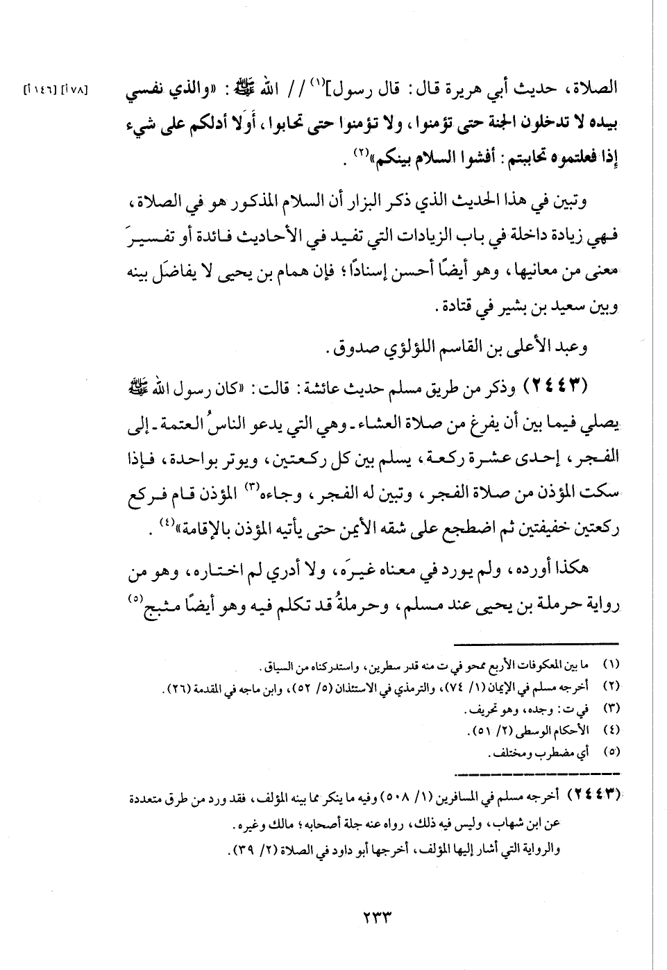 وَتبين فِي هَذَا الحَدِيث الَّذِي ذكر الْبَزَّار أَن السَّلَام الْمَذْكُور هُوَ فِي الصَّلَاة، فَهِيَ زِيَادَة دَاخِلَة فِي بَاب الزِّيَادَات الَّتِي تفِيد فِي الْأَحَادِيث فَائِدَة أَو تَفْسِير معنى من مَعَانِيهَا، وَهُوَ أَيْضا أحسن إِسْنَادًا، فَإِن همام بن يحيى لَا يفاضل بَينه وَبَين سعيد بن بشير فِي قَتَادَة.