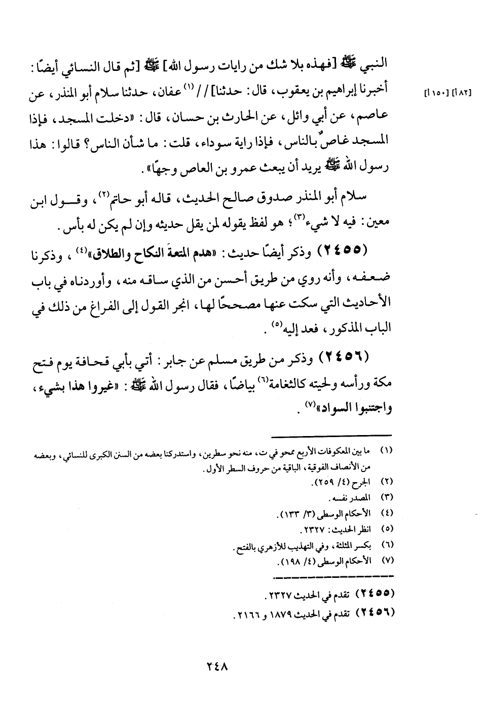 (2455) وَذكر أَيْضا حَدِيث: " هدم الْمُتْعَة النِّكَاح وَالطَّلَاق "، وَذكرنَا ضعفه، وَأَنه رُوِيَ من طَرِيق أحسن من الَّذِي سَاقه مِنْهُ، وأوردناه فِي بَاب الْأَحَادِيث الَّتِي سكت عَنْهَا مصححاً لَهَا، انجر القَوْل إِلَى الْفَرَاغ من ذَلِك فِي الْبَاب الْمَذْكُور، فعد إِلَيْهِ.