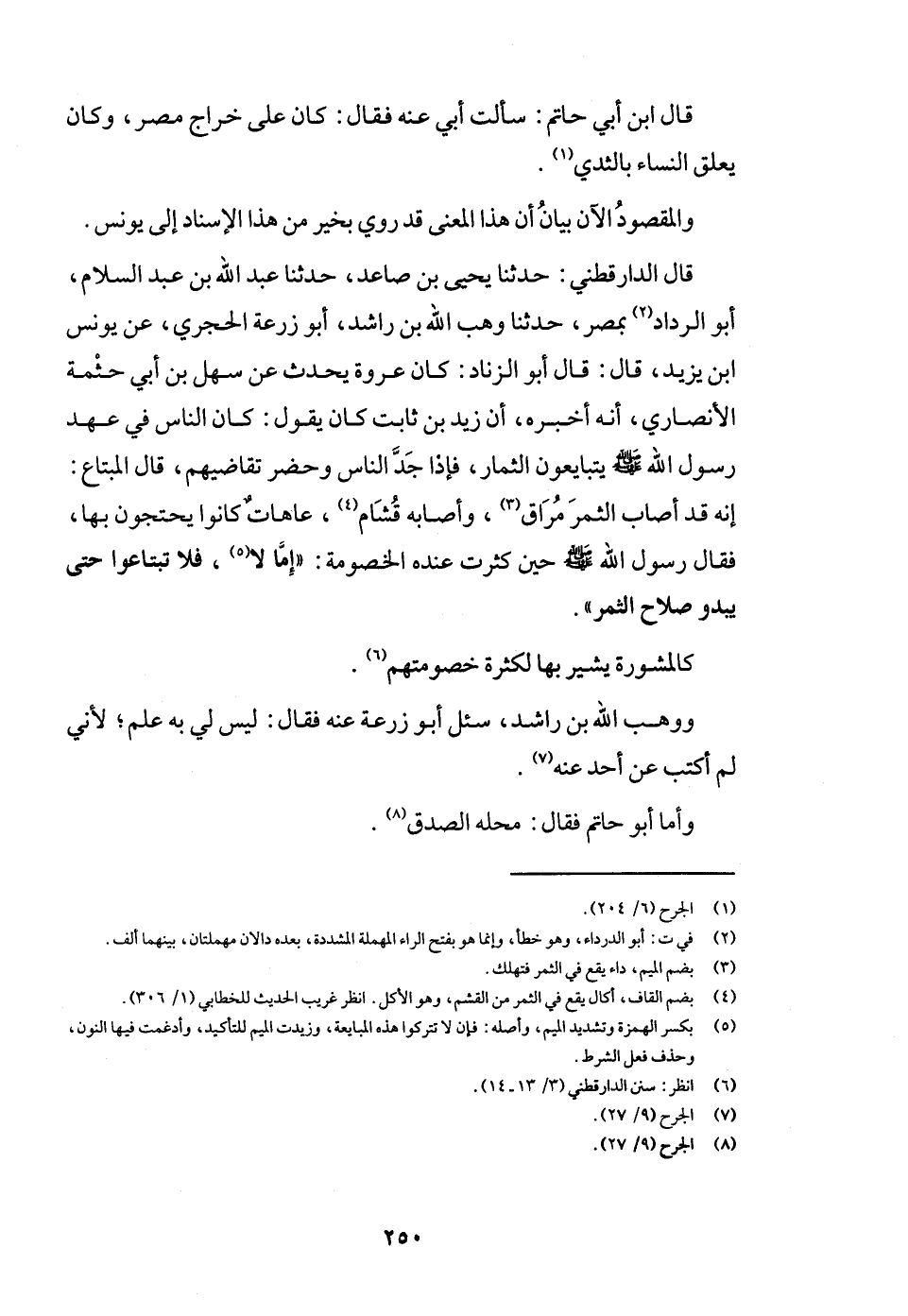قَالَ الدَّارَقُطْنِيّ: حَدثنَا يحيى بن صاعد، حَدثنَا عبد الله بن عبد السَّلَام، أَبُو الرداد بِمصْر، حَدثنَا وهب الله بن رَاشد، أَبُو زرْعَة الحجري، عَن يُونُس ابْن يزِيد، قَالَ: قَالَ أَبُو الزِّنَاد: كَانَ عُرْوَة يحدث عَن سهل بن أبي حثْمَة الْأنْصَارِيّ، أَنه أخبرهُ، أَن زيد بن ثَابت كَانَ يَقُول: كَانَ النَّاس فِي عهد رَسُول الله - صَلَّى اللَّهُ عَلَيْهِ وَسَلَّم َ - يتبايعون الثِّمَار، فَإِذا جد النَّاس وَحضر تقاضيهم، قَالَ الْمُبْتَاع: إِنَّه قد أصَاب الثَّمر مراق، وأصابه قشام، عاهات كَانُوا يحتجون بهَا، فَقَالَ رَسُول الله - صَلَّى اللَّهُ عَلَيْهِ وَسَلَّم َ - حِين كثرت عِنْده الْخُصُومَة: " إِمَّا لَا، فَلَا تبتاعوا حَتَّى يَبْدُو صَلَاح الثَّمر ".