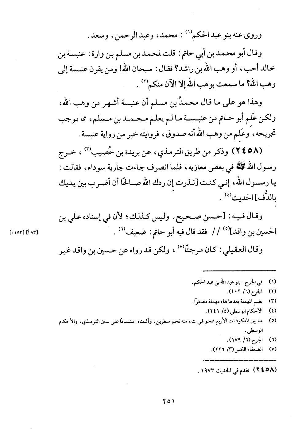 (2458) وَذكر من طَرِيق التِّرْمِذِيّ، عَن بُرَيْدَة بن حصيب، خرج رَسُول الله - صَلَّى اللَّهُ عَلَيْهِ وَسَلَّم َ - فِي بعض مغازيه، فَلَمَّا انْصَرف جَاءَت جَارِيَة سَوْدَاء، فَقَالَت: يَا رَسُول الله، إِنِّي كنت [نذرت إِن ردك الله صَالحا أَن أضْرب بَين يَديك بالدف] الحَدِيث.
