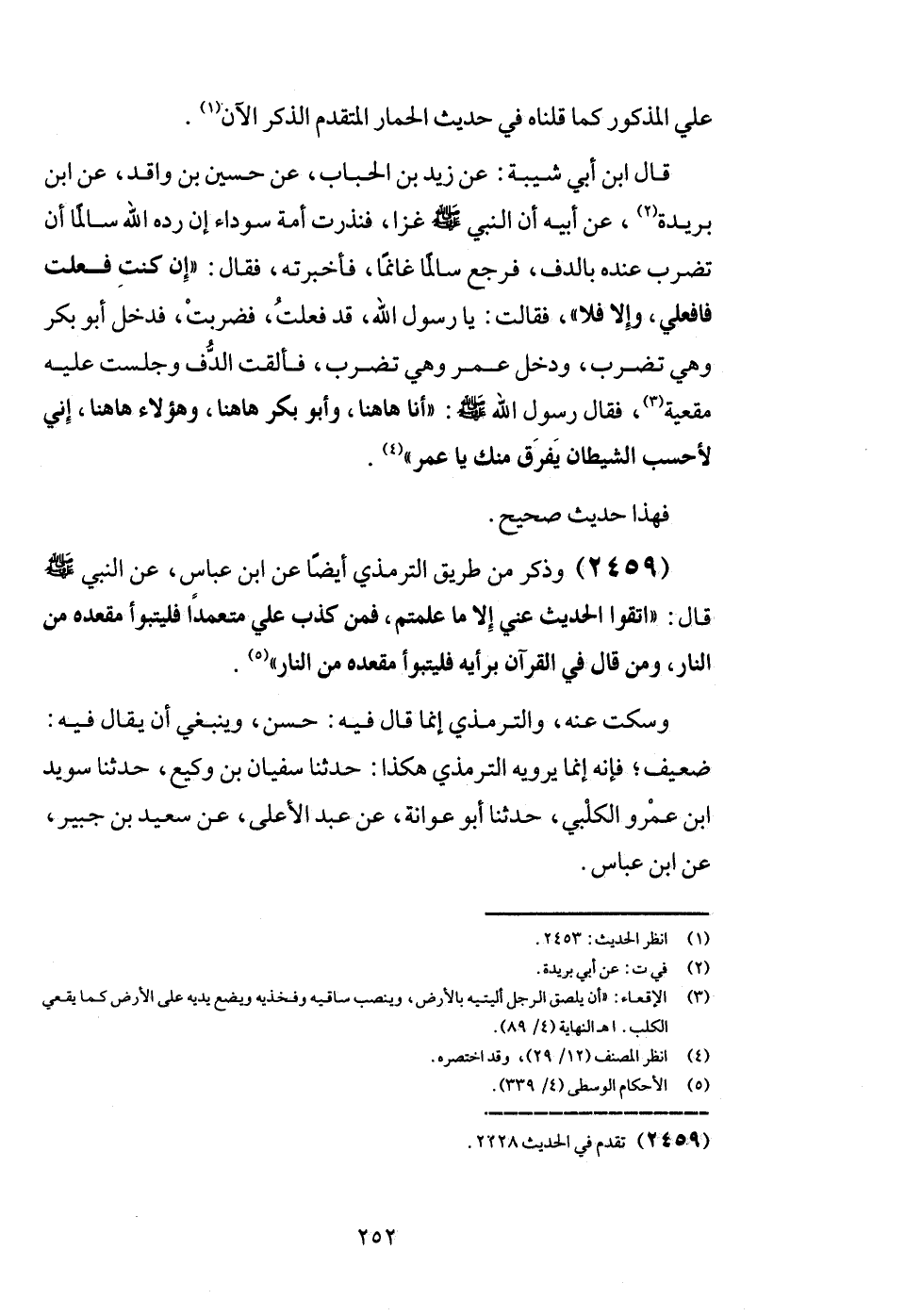 (2459) وَذكر من طَرِيق التِّرْمِذِيّ أَيْضا عَن ابْن عَبَّاس، عَن النَّبِي - صَلَّى اللَّهُ عَلَيْهِ وَسَلَّم َ - قَالَ: " اتَّقوا الحَدِيث عني إِلَّا مَا علمْتُم، فَمن كذب عَليّ مُتَعَمدا فَليَتَبَوَّأ مَقْعَده من النَّار، وَمن قَالَ فِي الْقُرْآن بِرَأْيهِ فليتبؤا مَقْعَده من النَّار ".