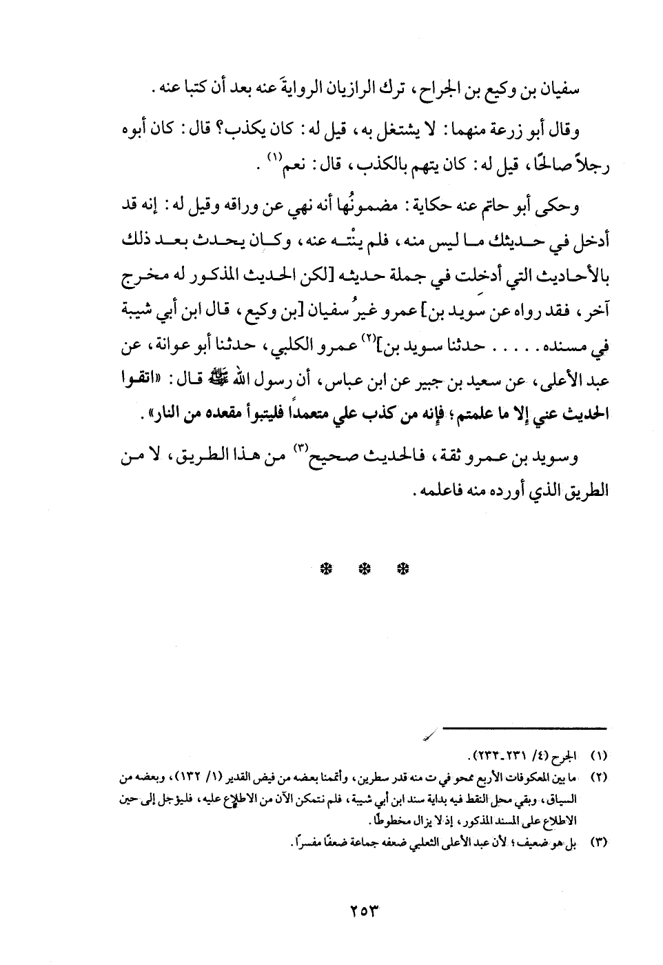 وَحكى أَبُو حَاتِم عَنهُ حِكَايَة: مضمونها أَنه نهي عَن وراقه وَقيل لَهُ: إِنَّه قد أَدخل فِي حَدِيثك مَا لَيْسَ مِنْهُ، فَلم ينْتَه عَنهُ، وَكَانَ يحدث بعد ذَلِك بالأحاديث الَّتِي أدخلت فِي جملَة حَدِيثه [لَكِن الحَدِيث الْمَذْكُور لَهُ مخرج آخر، فقد رَوَاهُ عَن سُوَيْد بن] عَمْرو غير سُفْيَان [بن وَكِيع، قَالَ ابْن أبي شيبَة فِي مُسْنده ... . حَدثنَا سُوَيْد بن] عَمْرو الْكَلْبِيّ، حَدثنَا أَبُو عوَانَة، عَن عبد الْأَعْلَى، عَن سعيد بن جُبَير عَن ابْن عَبَّاس، أَن رَسُول الله - صَلَّى اللَّهُ عَلَيْهِ وَسَلَّم َ - قَالَ: " اتَّقوا الحَدِيث عني إِلَّا مَا علمْتُم، فَإِنَّهُ من كذب عَليّ مُتَعَمدا فَليَتَبَوَّأ مَقْعَده من النَّار ".