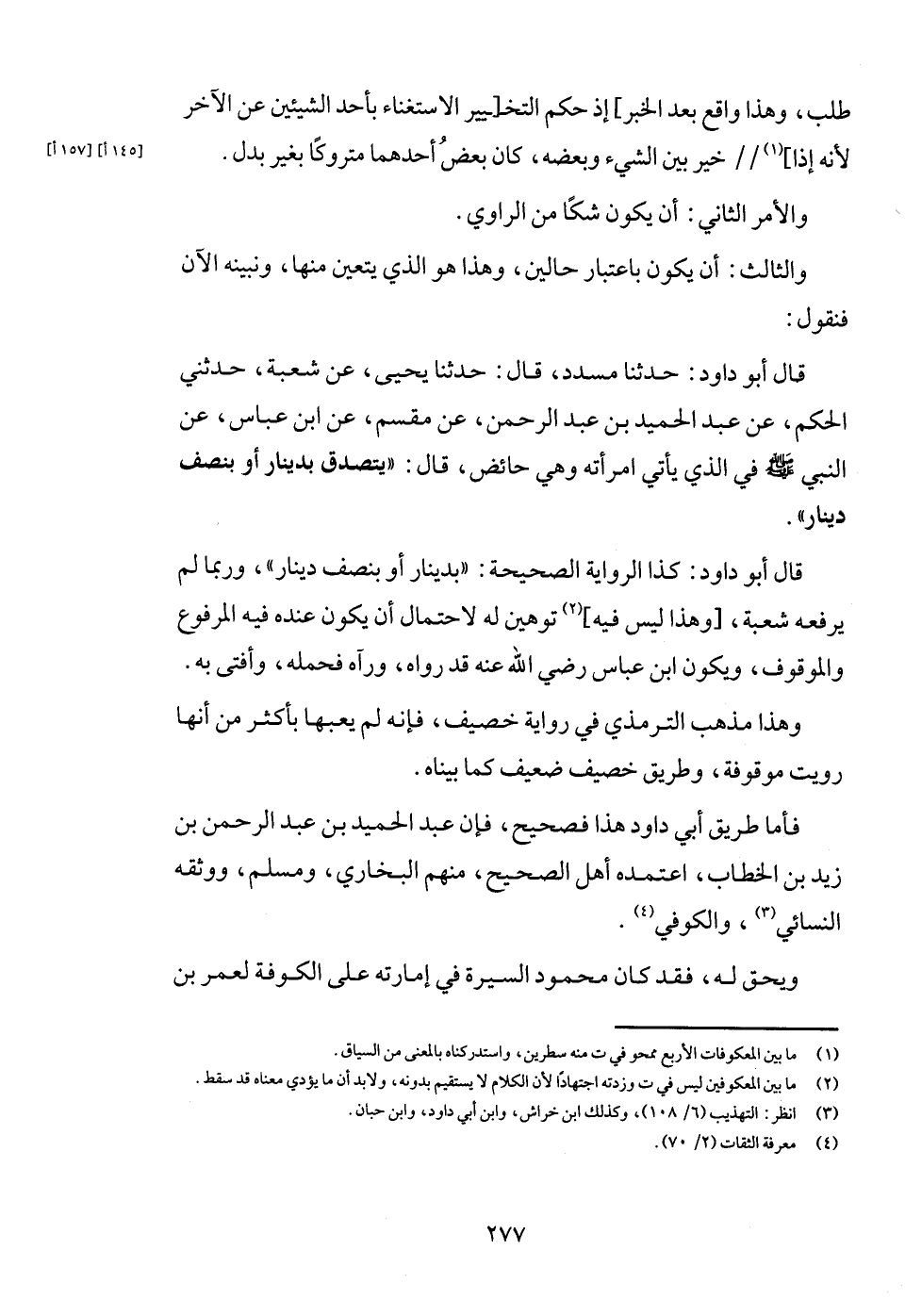 قَالَ أَبُو دَاوُد: كَذَا الرِّوَايَة الصَّحِيحَة: " بِدِينَار أَو بِنصْف دِينَار "، وَرُبمَا لم يرفعهُ شُعْبَة، [وَهَذَا لَيْسَ فِيهِ] توهين لَهُ لاحْتِمَال أَن يكون عِنْده فِيهِ الْمَرْفُوع وَالْمَوْقُوف، وَيكون ابْن عَبَّاس رَضِي الله عَنهُ قد رَوَاهُ، وَرَآهُ فَحَمله، وَأفْتى بِهِ