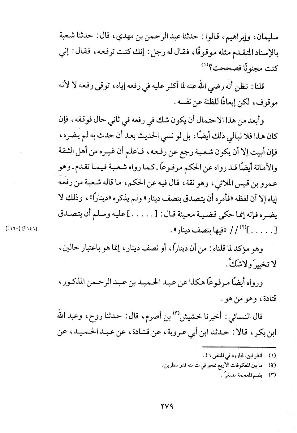 وَأبْعد من هَذَا الِاحْتِمَال أَن يكون شكّ فِي رَفعه فِي ثَانِي حَال فَوَقفهُ، فَإِن كَانَ هَذَا فَلَا نبالي ذَلِك أَيْضا، بل لَو نسي الحَدِيث بعد أَن حدث بِهِ لم يضرّهُ، فَإِن أَبيت إِلَّا أَن يكون شُعْبَة رَجَعَ عَن رَفعه، فَاعْلَم أَن غَيره من أهل الثِّقَة وَالْأَمَانَة أَيْضا قد رَوَاهُ عَن الحكم مَرْفُوعا كَمَا رَوَاهُ شُعْبَة فِيمَا تقدم وَهُوَ عَمْرو بن قيس الْملَائي، وَهُوَ ثِقَة، قَالَ فِيهِ عَن الحكم، مَا قَالَه شُعْبَة من رَفعه إِيَّاه إِلَّا أَن لَفظه هـ " فَأمره أَن يتَصَدَّق بِنصْف دِينَار " وَلم يذكرهُ " دِينَارا "، وَذَلِكَ لَا يضرّهُ فَإِنَّهُ إِنَّمَا حكى قَضِيَّة مُعينَة قَالَ [ ... .] عَلَيْهِ وَسلم أَن يتَصَدَّق [ ... .] " فِيهَا بِنصْف دِينَار ".
