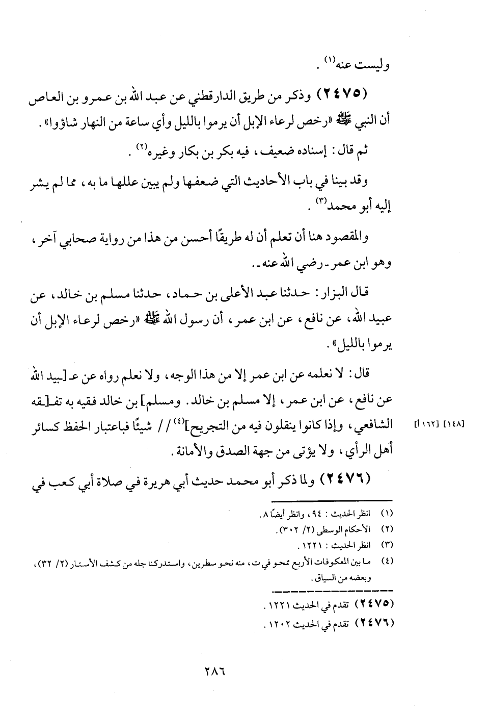 (2475) وَذكر من طَرِيق الدَّارَقُطْنِيّ عَن عبد الله بن عَمْرو بن الْعَاصِ أَن النَّبِي - صَلَّى اللَّهُ عَلَيْهِ وَسَلَّم َ -: " رخص لرعاء الْإِبِل أَن يرموا بِاللَّيْلِ وَأي سَاعَة من النَّهَار شاؤوا ".