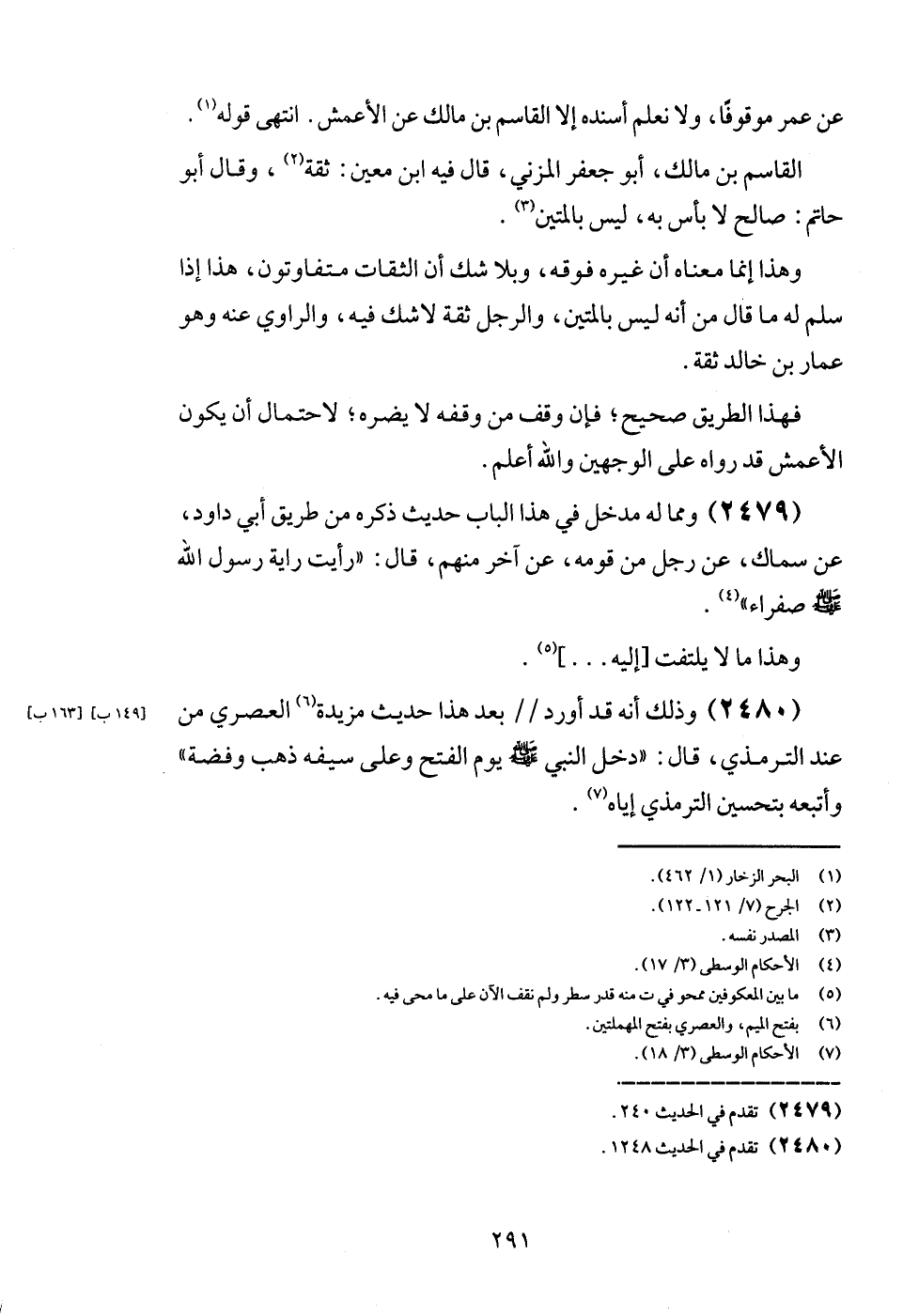 (2479) وَمِمَّا لَهُ مدْخل فِي هَذَا الْبَاب حَدِيث ذكره من طَرِيق أبي دَاوُد، عَن سماك، عَن رجل من قومه، عَن آخر مِنْهُم، قَالَ: " رَأَيْت راية رَسُول الله - صَلَّى اللَّهُ عَلَيْهِ وَسَلَّم َ - صفراء ".