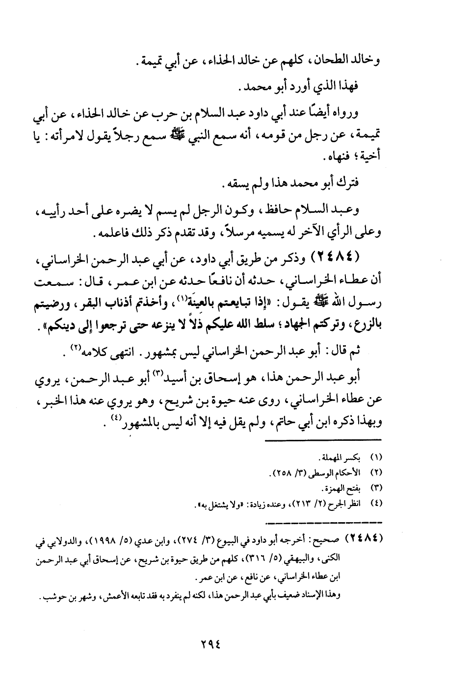 (2484) وَذكر من طَرِيق أبي دَاوُد، عَن أبي عبد الرَّحْمَن الْخُرَاسَانِي، أَن عَطاء الْخُرَاسَانِي، حَدثهُ أَن نَافِعًا حَدثهُ عَن ابْن عمر، قَالَ: سَمِعت رَسُول الله - صَلَّى اللَّهُ عَلَيْهِ وَسَلَّم َ - يَقُول: " إِذا تبايعتم بالعينة، وأخذتم أَذْنَاب الْبَقر، ورضيتم بالزرع، وتركتم الْجِهَاد، سلط الله عَلَيْكُم ذلاً لَا يَنْزعهُ حَتَّى ترجعوا إِلَى دينكُمْ ". ثمَّ قَالَ: أَبُو عبد الرَّحْمَن الْخُرَاسَانِي لَيْسَ بِمَشْهُور. انْتهى كَلَامه.
