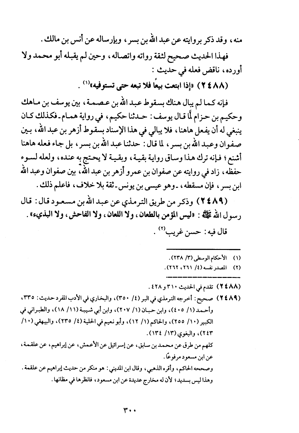 (2489) وَذكر من طَرِيق التِّرْمِذِيّ عَن عبد الله بن مَسْعُود قَالَ: قَالَ رَسُول الله - صَلَّى اللَّهُ عَلَيْهِ وَسَلَّم َ -: " لَيْسَ الْمُؤمن بالطعان، وَلَا اللّعان، وَلَا الْفَاحِش، وَلَا الْبَذِيء ".