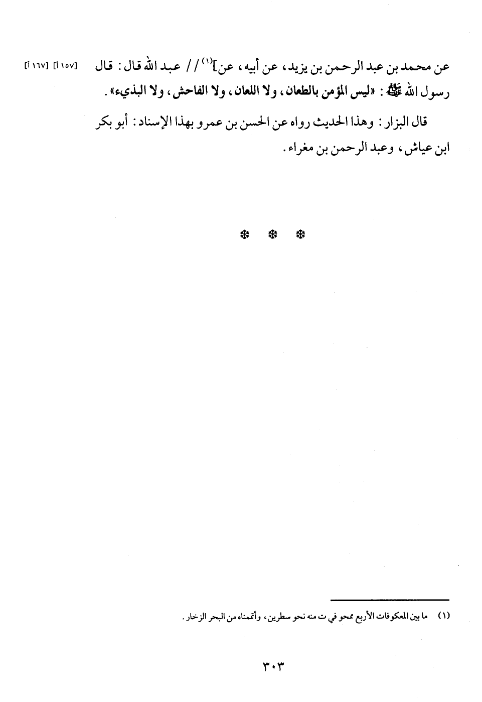 عَن مُحَمَّد بن عبد الرَّحْمَن بن يزِيد، عَن أَبِيه، عَن] عبد الله قَالَ: قَالَ رَسُول الله - صَلَّى اللَّهُ عَلَيْهِ وَسَلَّم َ -: " لَيْسَ الْمُؤمن بالطعان، وَلَا اللّعان، وَلَا الْفَاحِش، وَلَا الْبَذِيء ".