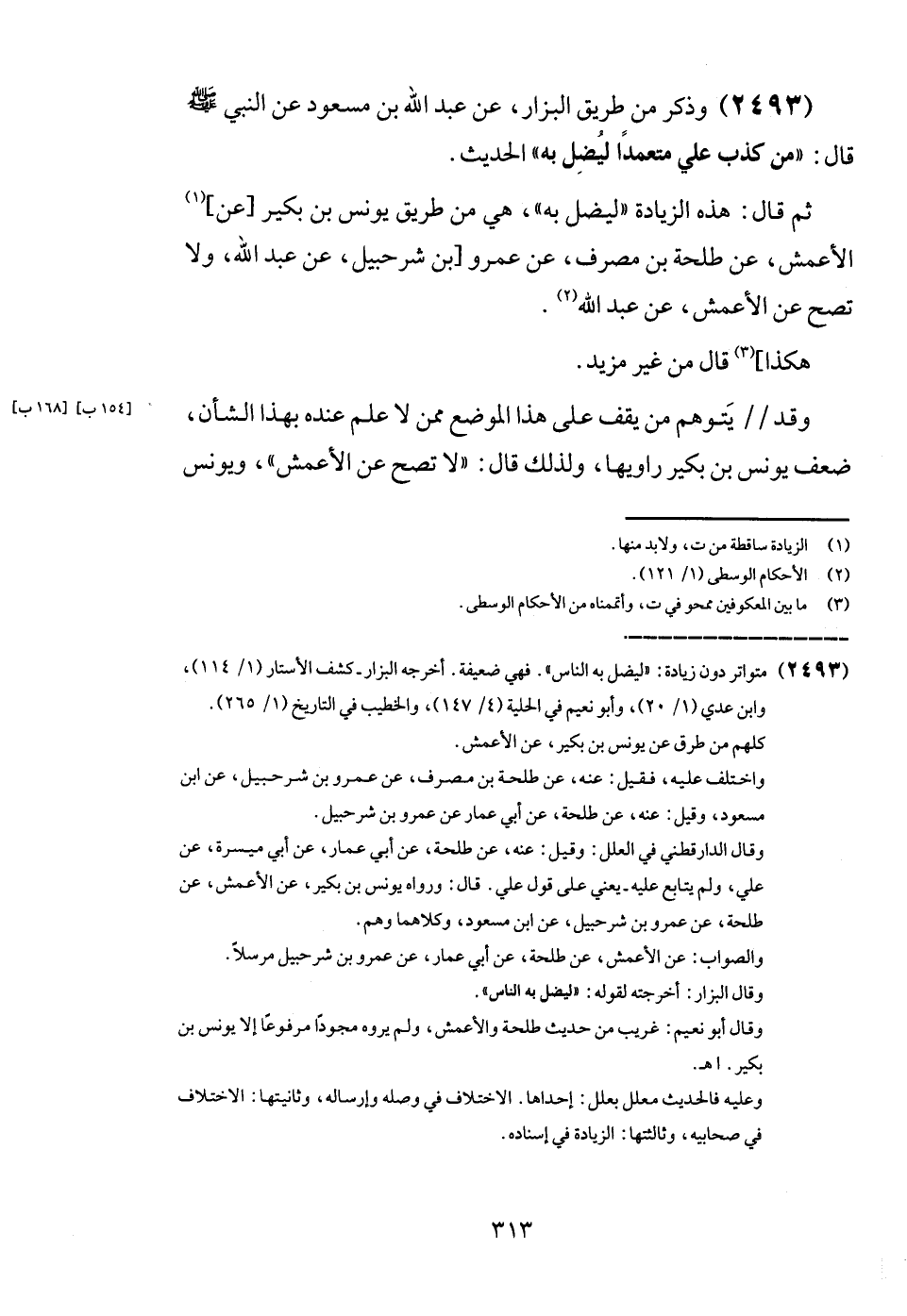 (2493) وَذكر من طَرِيق الْبَزَّار، عَن عبد الله بن مَسْعُود عَن النَّبِي - صَلَّى اللَّهُ عَلَيْهِ وَسَلَّم َ - قَالَ: " من كذب عَليّ مُتَعَمدا ليضل بِهِ " الحَدِيث.