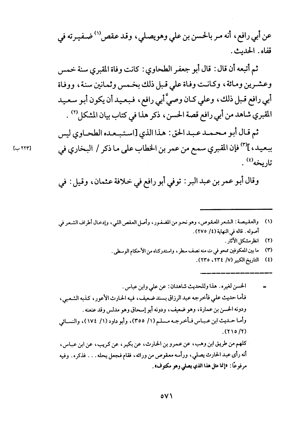ثمَّ أتبعه أَن قَالَ: قَالَ أَبُو جَعْفَر الطَّحَاوِيّ: كَانَت وَفَاة المَقْبُري سنة خمس وَعشْرين وَمِائَة، وَكَانَت وَفَاة عَليّ قبل ذَلِك بِخمْس وَثَمَانِينَ سنة، ووفاة أبي رَافع قبل ذَلِك، وَعلي كَانَ وَصِيّ أبي رَافع، فبعيد أَن يكون أَبُو سعيد المَقْبُري شَاهد من أبي رَافع قصَّة الْحسن، ذكر هَذَا فِي كتاب بَيَان الْمُشكل.