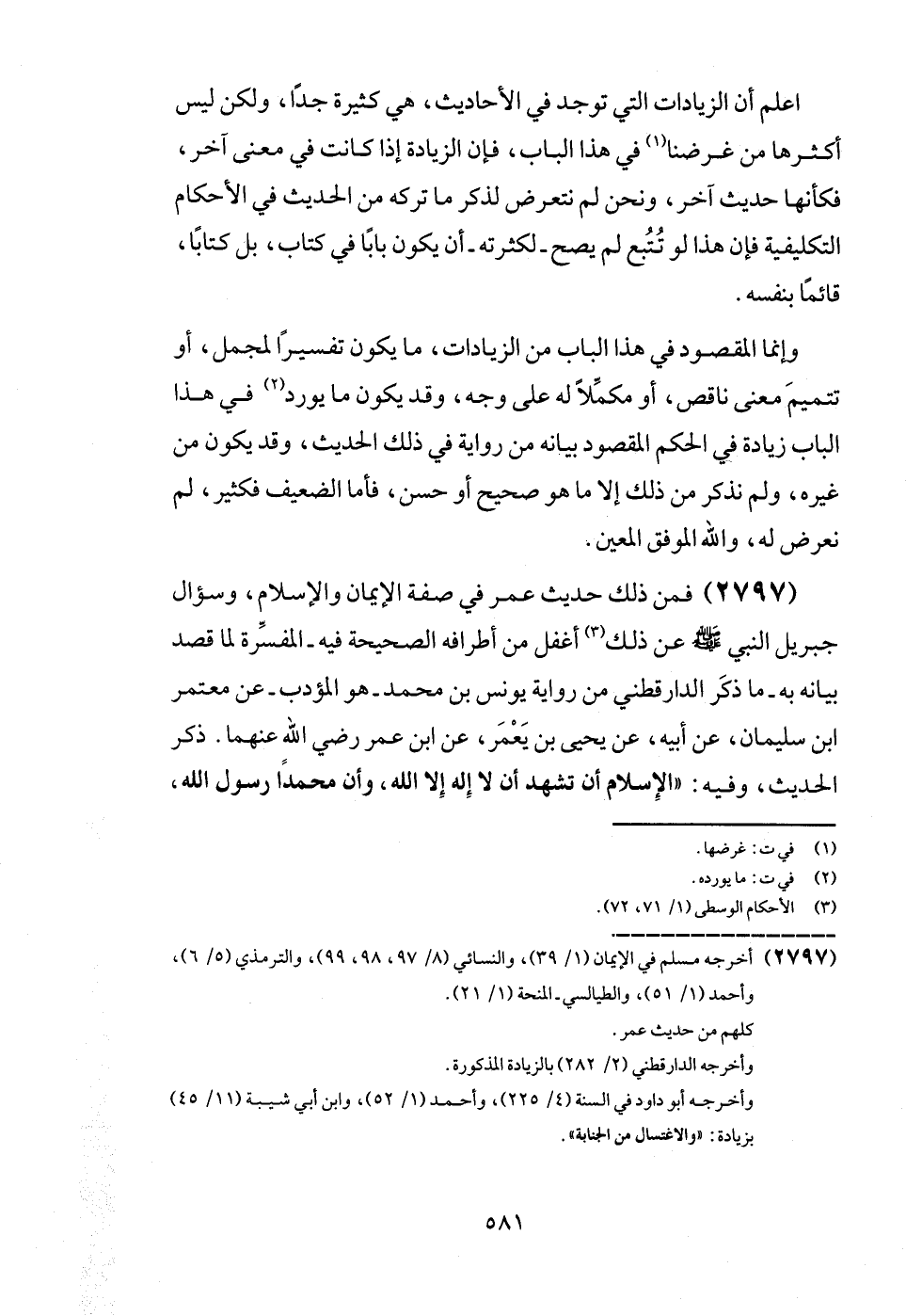 (2797) فَمن ذَلِك حَدِيث عمر فِي صفة الْإِيمَان وَالْإِسْلَام، وسؤال جِبْرِيل النَّبِي - صَلَّى اللَّهُ عَلَيْهِ وَسَلَّم َ - عَن ذَلِك أغفل من أَطْرَافه الصَّحِيحَة فِيهِ - المفسرة لما قصد بَيَانه بِهِ - مَا ذكر الدَّارَقُطْنِيّ من رِوَايَة يُونُس بن مُحَمَّد - هُوَ الْمُؤَدب - عَن مُعْتَمر ابْن سُلَيْمَان، عَن أَبِيه، عَن يحيى بن يعمر، عَن ابْن عمر رَضِي الله عَنْهُمَا. ذكر الحَدِيث، وَفِيه: " الْإِسْلَام أَن تشهد أَن لَا إِلَه إِلَّا الله، وَأَن مُحَمَّدًا رَسُول الله،