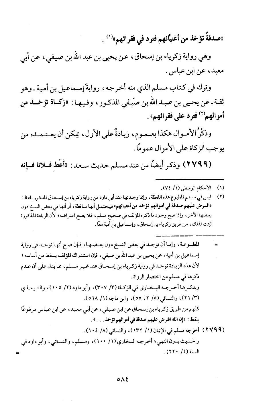 وَترك فِي كتاب مُسلم الَّذِي مِنْهُ أخرجه، رِوَايَة إِسْمَاعِيل بن أُميَّة - وَهُوَ ثِقَة - عَن يحيى بن عبد الله بن صَيْفِي الْمَذْكُور، وفيهَا: " زَكَاة تُؤْخَذ من أَمْوَالهم فَترد على فقرائهم ".