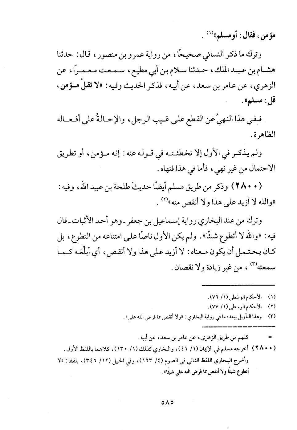 وَترك مَا ذكر النَّسَائِيّ صَحِيحا، من رِوَايَة عَمْرو بن مَنْصُور، قَالَ: حَدثنَا هِشَام بن عبد الْملك، حَدثنَا سَلام بن أبي مُطِيع، سَمِعت معمرا، عَن الزُّهْرِيّ، عَن عَامر بن سعد، عَن أَبِيه، فَذكر الحَدِيث وَفِيه: " لَا تقل مُؤمن، قل: مُسلم ".