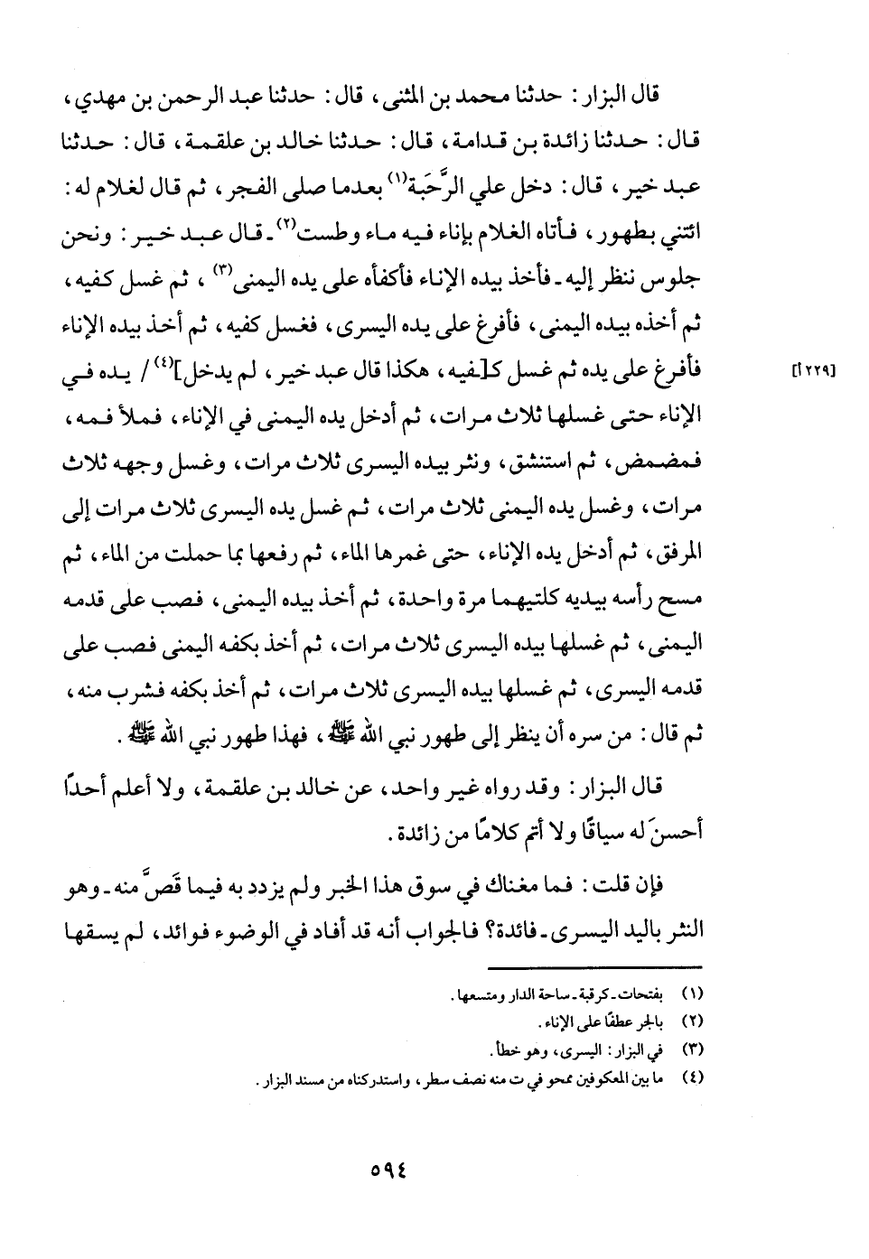 قَالَ الْبَزَّار: حَدثنَا مُحَمَّد بن الْمثنى، قَالَ: حَدثنَا عبد الرَّحْمَن بن مهْدي، قَالَ: حَدثنَا زَائِدَة بن قدامَة، قَالَ: حَدثنَا خَالِد بن عَلْقَمَة، قَالَ: حَدثنَا عبد خير، قَالَ: دخل عَليّ الرحبة بَعْدَمَا صلى الْفجْر، ثمَّ قَالَ لغلام لَهُ: ائْتِنِي بِطهُور، فَأَتَاهُ الْغُلَام بِإِنَاء فِيهِ مَاء وطست - قَالَ عبد الْخَيْر: وَنحن جُلُوس نَنْظُر إِلَيْهِ - فَأخذ بِيَدِهِ الْإِنَاء فأكفأه على يَده الْيُمْنَى، ثمَّ غسل كفيه، ثمَّ أَخذ بِيَدِهِ الْيُمْنَى، فأفرغ على يَده الْيُسْرَى، فَغسل كفيه، ثمَّ أَخذ بِيَدِهِ الْإِنَاء فأفرغ على يَده ثمَّ غسل ك [فِيهِ، هَكَذَا قَالَ عبد خير، لم يدْخل] / يَده فِي الْإِنَاء حَتَّى غسلهَا ثَلَاث مَرَّات، ثمَّ أَدخل يَده الْيُمْنَى فِي الْإِنَاء، فَمَلَأ فَمه، فَمَضْمض، ثمَّ استنشق، ونثر بِيَدِهِ الْيُسْرَى ثَلَاث مَرَّات، وَغسل وَجهه ثَلَاث مَرَّات، وَغسل يَده الْيُمْنَى ثَلَاث مَرَّات، ثمَّ غسل يَده الْيُسْرَى ثَلَاث مَرَّات إِلَى الْمرْفق، ثمَّ أَدخل يَده الْإِنَاء، حَتَّى غمرها المَاء، ثمَّ رَفعهَا بِمَا حملت من المَاء، ثمَّ مسح رَأسه بيدَيْهِ كلتيهما مرّة وَاحِدَة، ثمَّ أَخذ بِيَدِهِ الْيُمْنَى، فصب على قدمه الْيُمْنَى، ثمَّ غسلهَا بِيَدِهِ الْيُسْرَى ثَلَاث مَرَّات، ثمَّ أَخذ بكفه الْيُمْنَى فصب على قدمه الْيُسْرَى، ثمَّ غسلهَا بِيَدِهِ الْيُسْرَى ثَلَاث مَرَّات، ثمَّ اخذ بكفه فَشرب مِنْهُ، ثمَّ قَالَ: من سره أَن ينظر إِلَى طهُور نَبِي الله - صَلَّى اللَّهُ عَلَيْهِ وَسَلَّم َ -، فَهَذَا طهُور نَبِي الله - صَلَّى اللَّهُ عَلَيْهِ وَسَلَّم َ -.