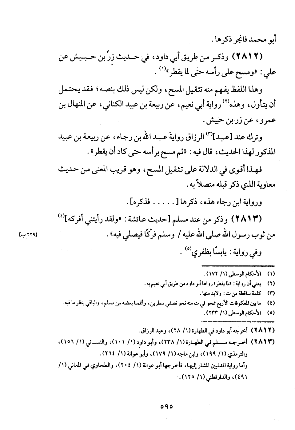(2812) وَذكر من طَرِيق أبي دَاوُد، فِي حَدِيث زر بن حُبَيْش عَن عَليّ: " وَمسح على رَأسه حَتَّى لما يقطر ".