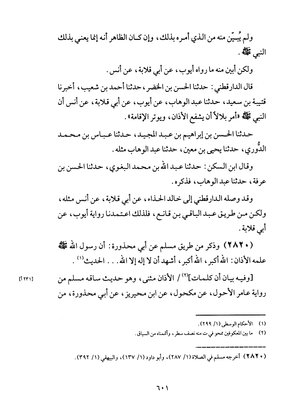 قَالَ الدَّارَقُطْنِيّ: حَدثنَا الْحسن بن الْخضر، حَدثنَا أَحْمد بن شُعَيْب، أخبرنَا قُتَيْبَة بن سعيد، حَدثنَا عبد الْوَهَّاب، عَن أَيُّوب، عَن أبي قلَابَة، عَن أنس أَن النَّبِي - صَلَّى اللَّهُ عَلَيْهِ وَسَلَّم َ - " أَمر بِلَالًا أَن يشفع الْأَذَان، ويوتر الْإِقَامَة ".