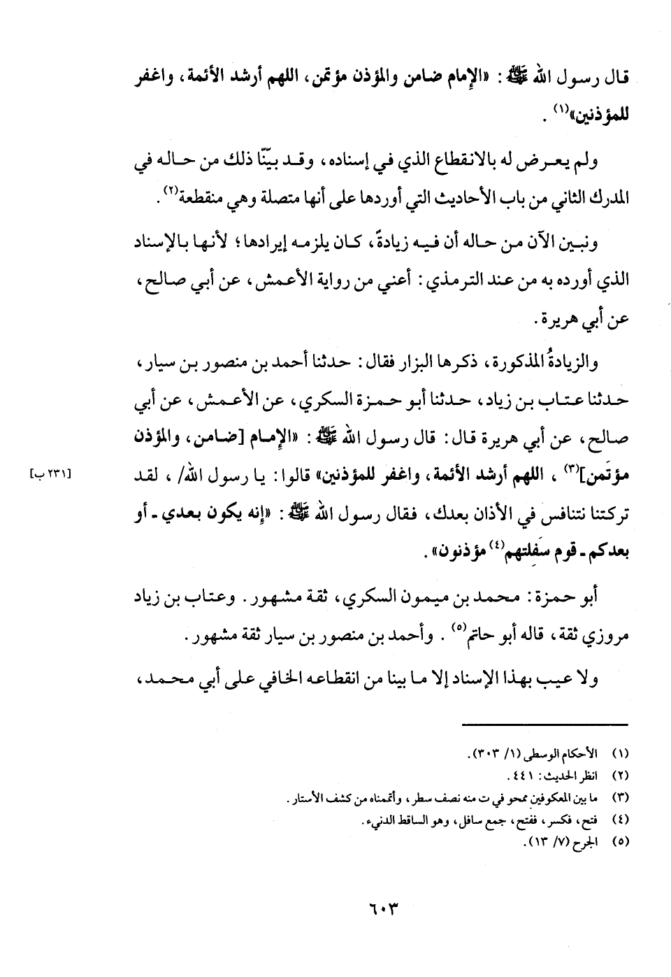 وَالزِّيَادَة الْمَذْكُورَة، ذكرهَا الْبَزَّار فَقَالَ: حَدثنَا أَحْمد بن مَنْصُور بن سيار، حَدثنَا عتاب بن زِيَاد، حَدثنَا أَبُو حَمْزَة السكرِي، عَن الْأَعْمَش، عَن أبي صَالح، عَن أبي هُرَيْرَة قَالَ قَالَ رَسُول الله - صَلَّى اللَّهُ عَلَيْهِ وَسَلَّم َ -: " الإِمَام [ضَامِن، والمؤذن مؤتمن] ، اللَّهُمَّ أرشد الْأَئِمَّة، واغفر للمؤذنين " قَالُوا: يَا رَسُول الله /، لقد تركتنا نتنافس فِي الْأَذَان بعْدك، فَقَالَ رَسُول الله - صَلَّى اللَّهُ عَلَيْهِ وَسَلَّم َ -: " إِنَّه يكون بعدِي - أَو بعدكم _ قوم سفلتهم مؤذنون ".