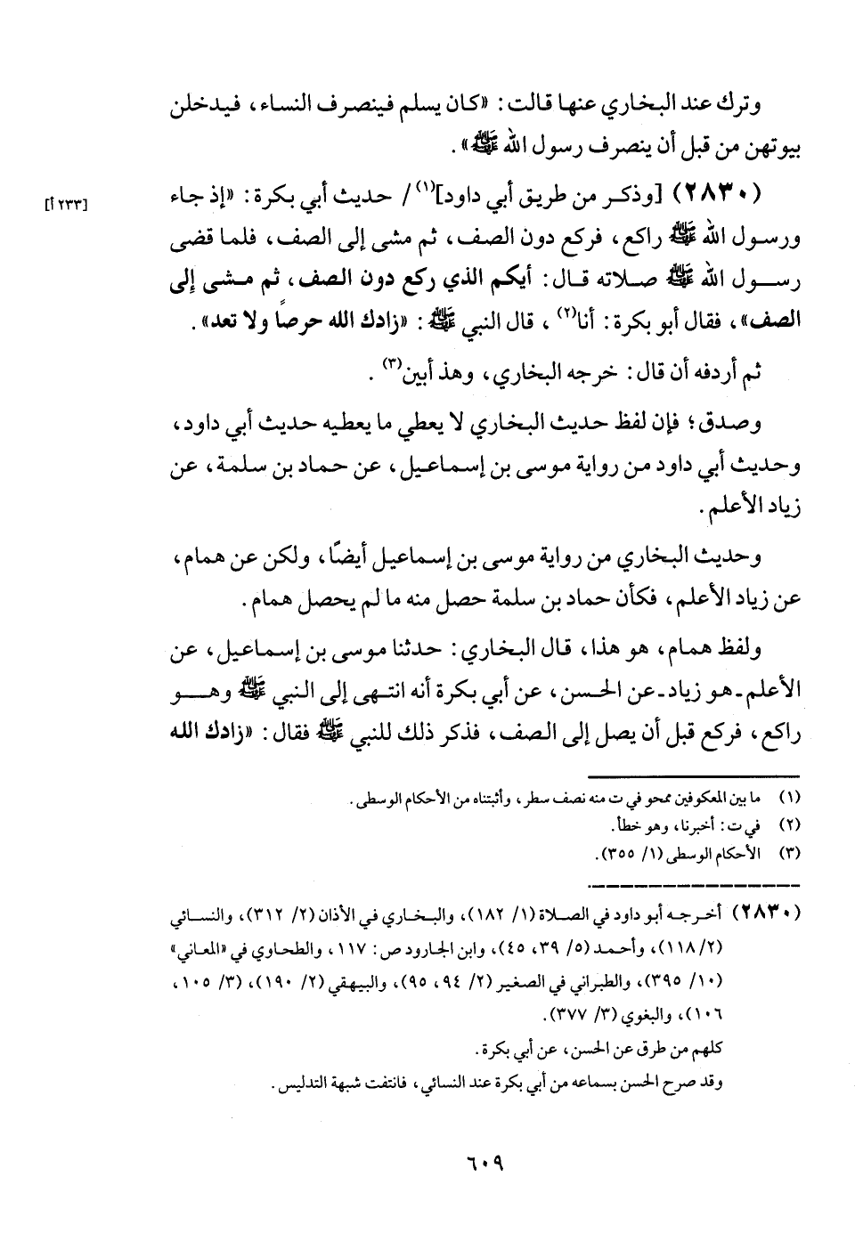 (2830) [وَذكر من طَرِيق أبي دَاوُد] / حَدِيث أبي بكرَة: " إِذْ جَاءَ وَرَسُول الله - صَلَّى اللَّهُ عَلَيْهِ وَسَلَّم َ - رَاكِع، فَرَكَعَ دون الصَّفّ، ثمَّ مَشى إِلَى الصَّفّ، فَلَمَّا قضى رَسُول الله - صَلَّى اللَّهُ عَلَيْهِ وَسَلَّم َ - صلَاته قَالَ: أَيّكُم الَّذِي ركع دون الصَّفّ، ثمَّ مَشى إِلَى الصَّفّ "، فَقَالَ أَبُو بكرَة: أَنا، قَالَ النَّبِي - صَلَّى اللَّهُ عَلَيْهِ وَسَلَّم َ -: " زادك الله حرصا وَلَا تعد ".