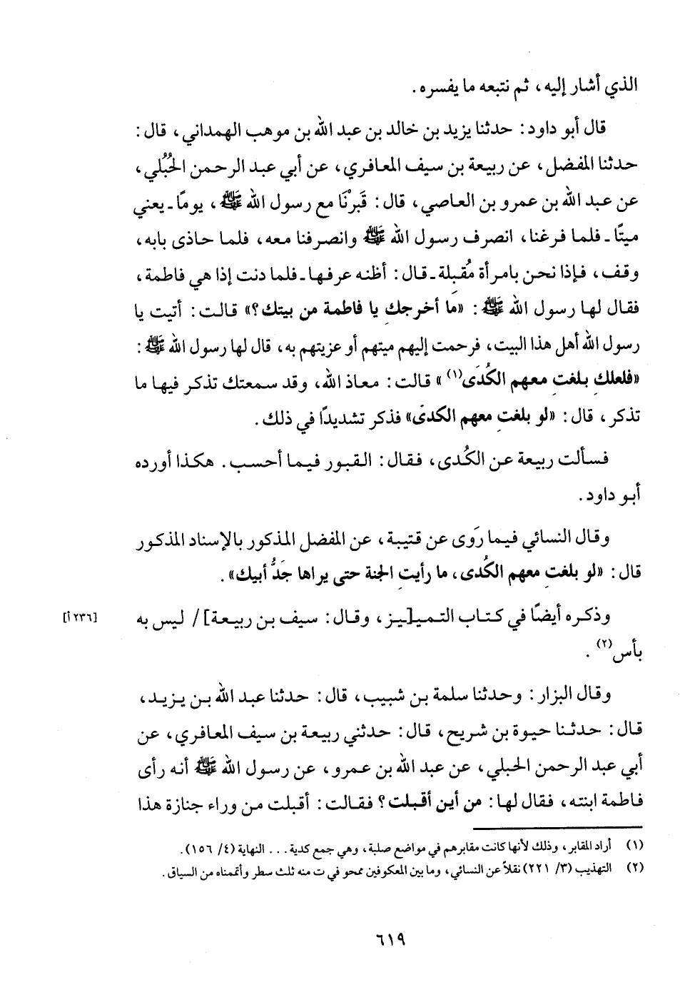 قَالَ أَبُو دَاوُد: حَدثنَا يزِيد بن خَالِد بن عبد الله بن موهب الْهَمدَانِي، قَالَ: حَدثنَا الْمفضل، عَن ربيعَة بن سيف الْمعَافِرِي، عَن أبي عبد الرَّحْمَن الحبلي، عَن عبد الله بن عَمْرو بن العَاصِي، قَالَ قبرنا مَعَ رَسُول الله - صَلَّى اللَّهُ عَلَيْهِ وَسَلَّم َ -، يَوْمًا - يَعْنِي مَيتا - فَلَمَّا فَرغْنَا، انْصَرف رَسُول الله - صَلَّى اللَّهُ عَلَيْهِ وَسَلَّم َ - وانصرفنا مَعَه، فَلَمَّا حَاذَى بَابه، وقف، فَإِذا نَحن بِامْرَأَة مقبلة - قَالَ: أَظُنهُ عرفهَا - فَلَمَّا دنت إِذا هِيَ فَاطِمَة، فَقَالَ لَهَا رَسُول الله - صَلَّى اللَّهُ عَلَيْهِ وَسَلَّم َ -: " مَا أخرجك يَا فَاطِمَة من بَيْتك؟ " قَالَت: أتيت يَا رَسُول الله أهل هَذَا الْبَيْت، فرحمت إِلَيْهِم ميتهم أَو عزيتهم بِهِ، قَالَ لَهَا رَسُول الله - صَلَّى اللَّهُ عَلَيْهِ وَسَلَّم َ -: " فلعلك بلغت مَعَهم الكدى " قَالَت: معَاذ الله، وَقد سَمِعتك تذكر فِيهَا مَا تذكر، قَالَ: " لَو بلغت مَعَهم الكدى " فَذكر تشيدا فِي ذَلِك.