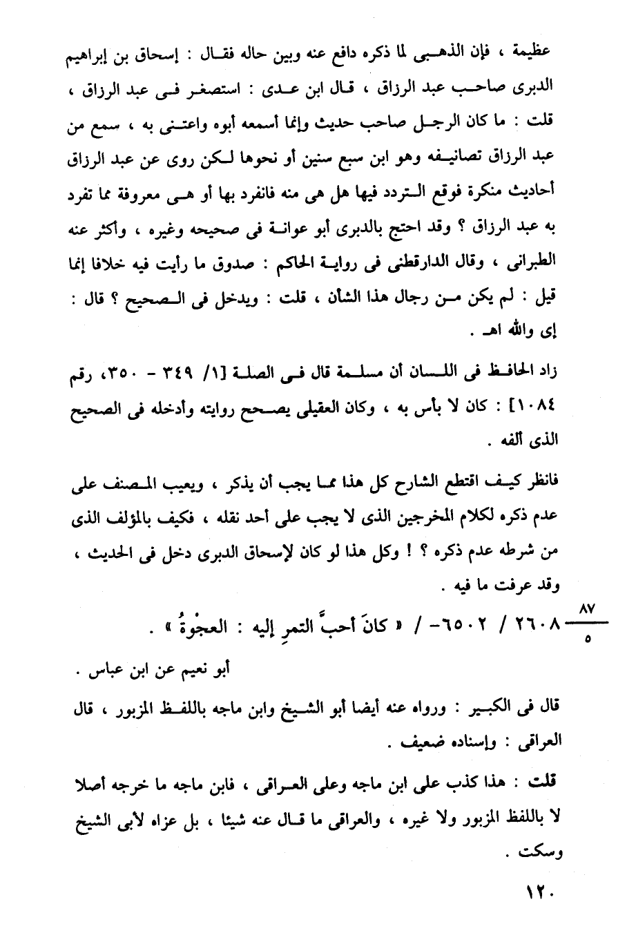 عظيمة، فإن الذهبى لما ذكره دافع عنه وبين حاله فقال: إسحاق بن إبراهيم الدبرى صاحب عبد الرزاق، قال ابن عدى: استصغر في عبد الرزاق، قلت: ما كان الرجل صاحب حديث وإنما أسمعه أبوه واعتنى به، سمع من عبد الرزاق تصانيفه وهو ابن سبع سنين أو نحوها لكن روى عن عبد الرزاق أحاديث منكرة فوقع التردد فيها هل هي منه فانفرد بها أو هي معروفة مما تفرد به عبد الرزاق؟ وقد احتج بالدبرى أبو عوانة في صحيحه وغيره، وأكثر عنه الطبرانى، وقال الدارقطنى في رواية الحاكم: صدوق ما رأيت فيه خلافا إنما قيل: لم يكن من رجال هذا الشأن، قلت: ويدخل في الصحيح؟ قال: إى واللَّه اهـ.